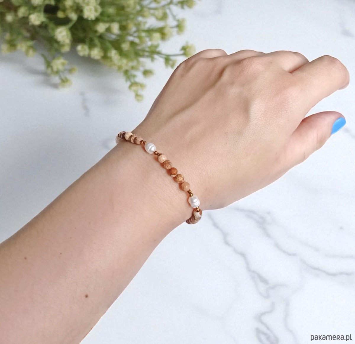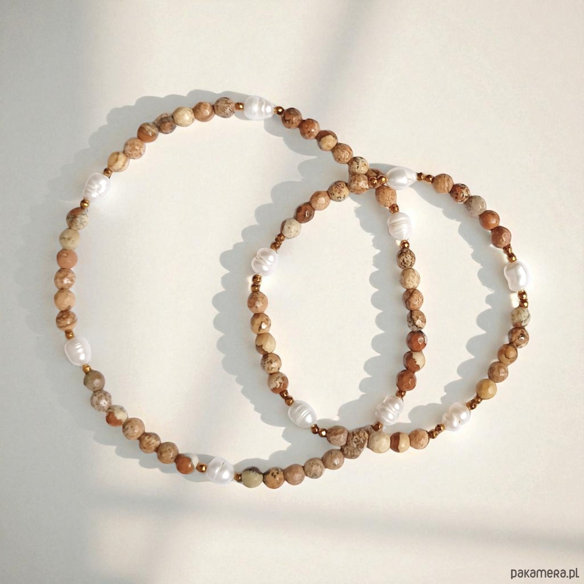 Bransoletki na solidnej lince elastycznej, wykonana z jaspisu krajobrazowego w odcieniach beżu i brązu (fasetowane kule 4mm), pereł słodkowodnych, fasetowanego hematytu.
