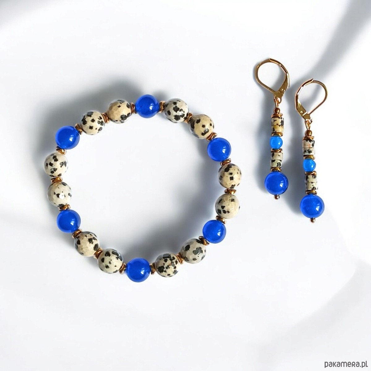 Kolorowa i niepoważna bransoletka na solidnej lince elastycznej, wykonana z fasetowanego jaspisu dalmatyńskiego (ok. 8mm) oraz soczystego jadeitu (chabrowy niebieski) i przekładek ze złotego hematytu.