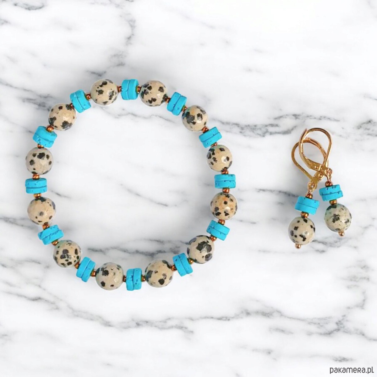 Kolorowa i niepoważna bransoletka na solidnej lince elastycznej, wykonana z fasetowanego jaspisu dalmatyńskiego (ok. 9mm) oraz turkusowej, porowatej lawy i przekładek ze złotego hematytu.
