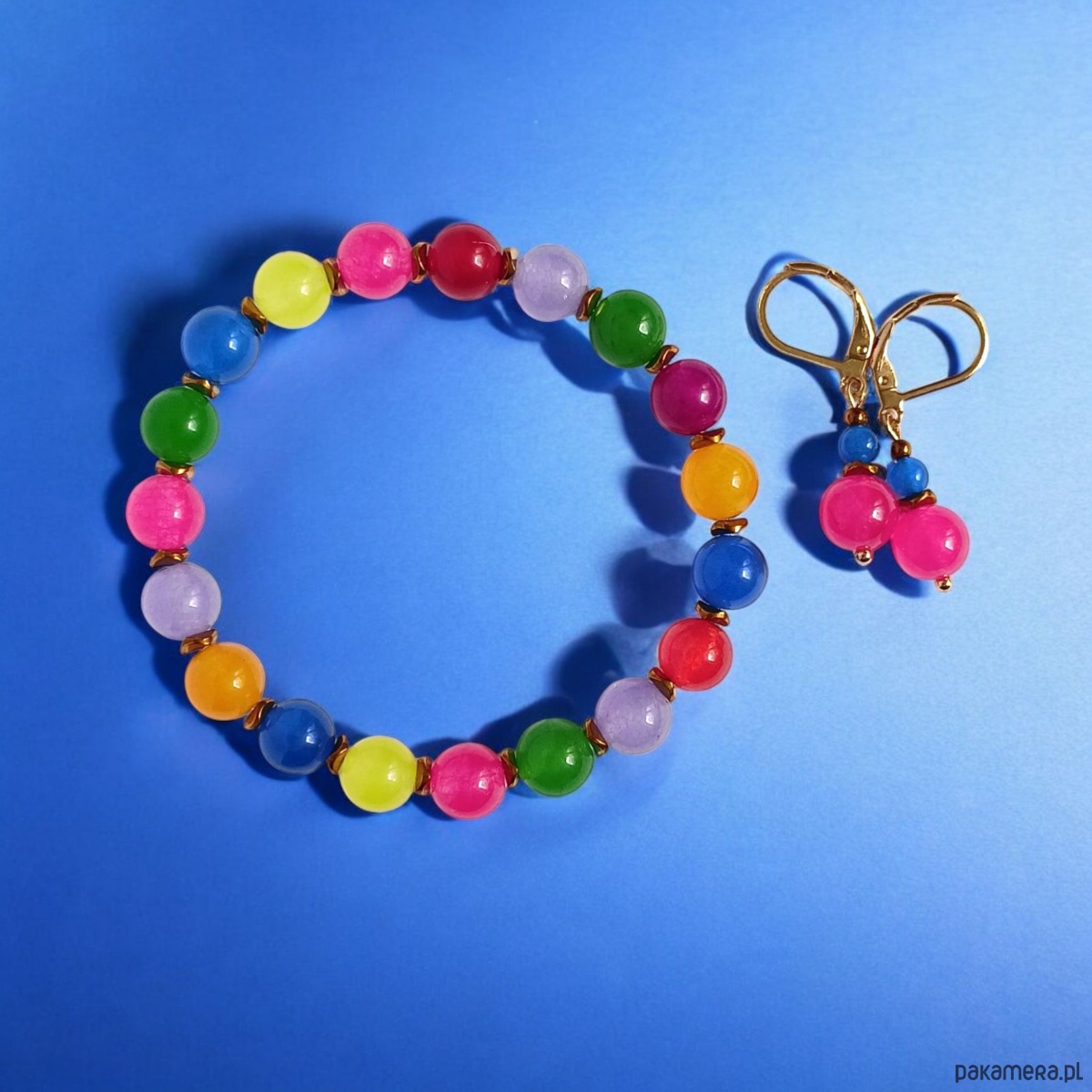 Kolorowa i niepoważna bransoletka na solidnej lince elastycznej, wykonana z jadeitu w soczystych kolorach (8mm) oraz licznych przekładek ze złotego hematytu.