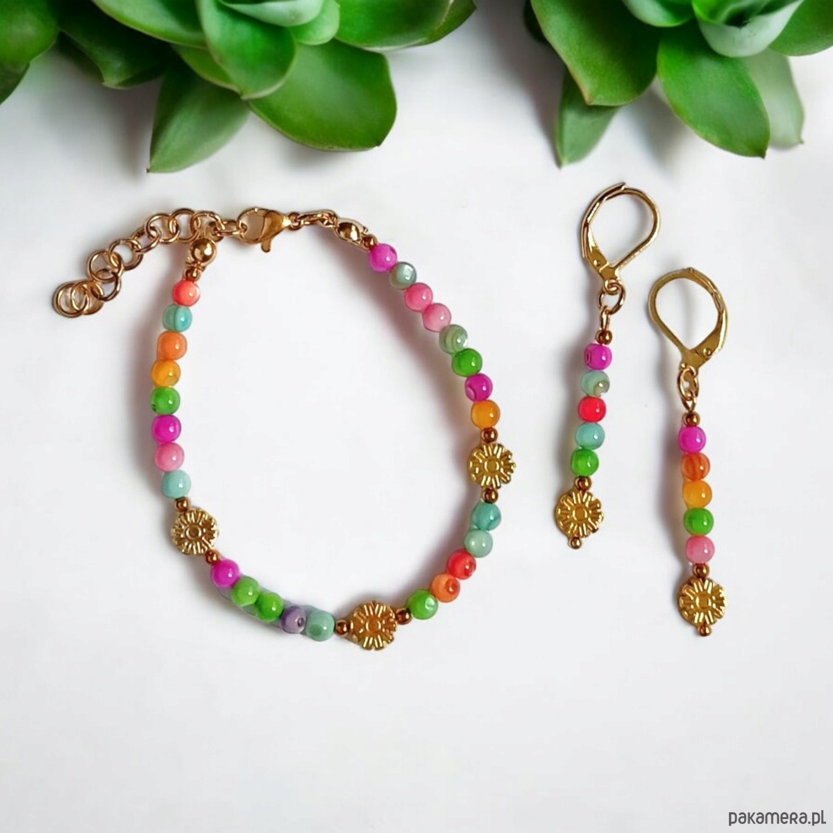 Kolczyki wykonane z kolorowej muszli (kuleczki 4mm), przekładek - kwiatuszków ze złotego hematytu, kuleczek hematytu 2mm.