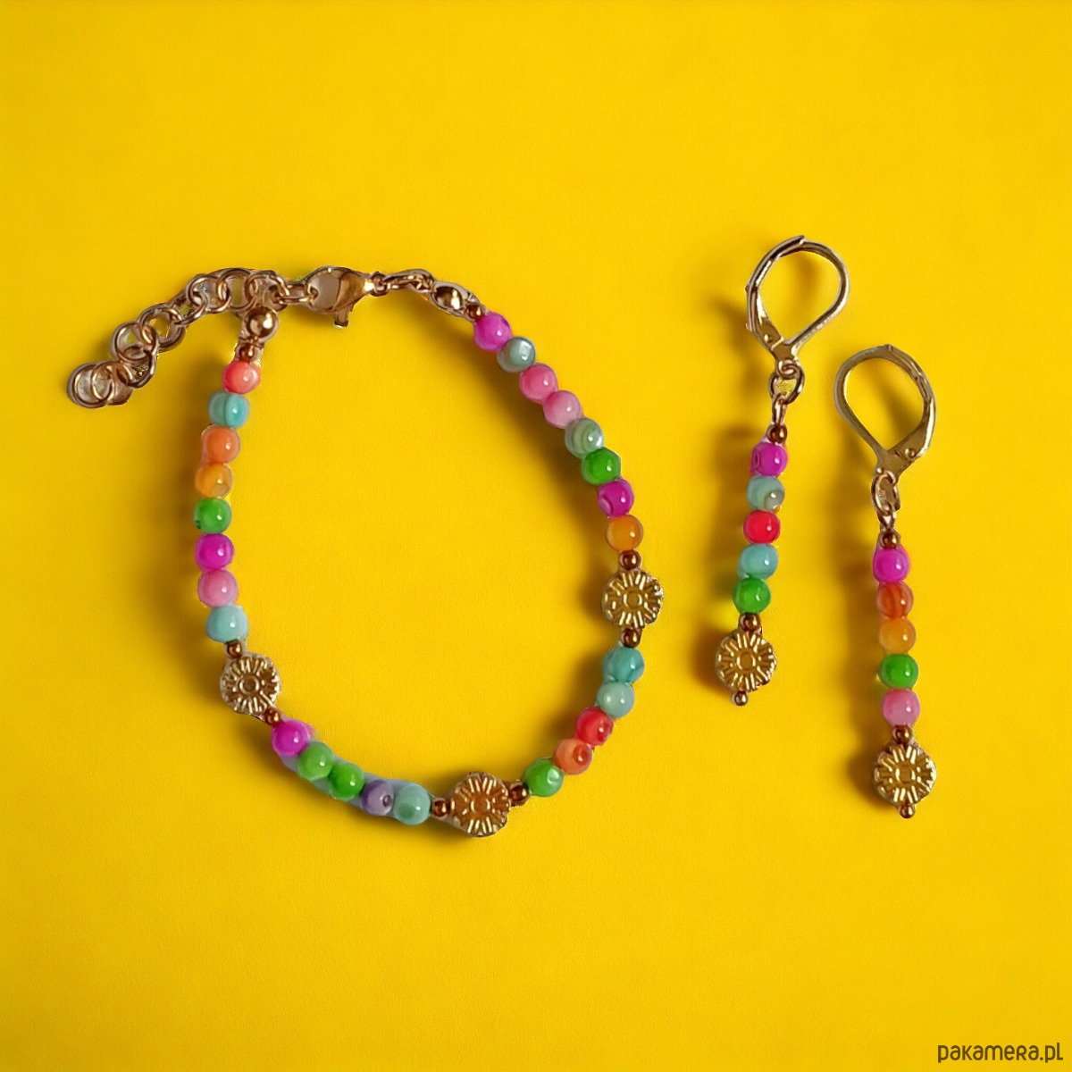 Kolczyki wykonane z kolorowej muszli (kuleczki 4mm), przekładek - kwiatuszków ze złotego hematytu, kuleczek hematytu 2mm.