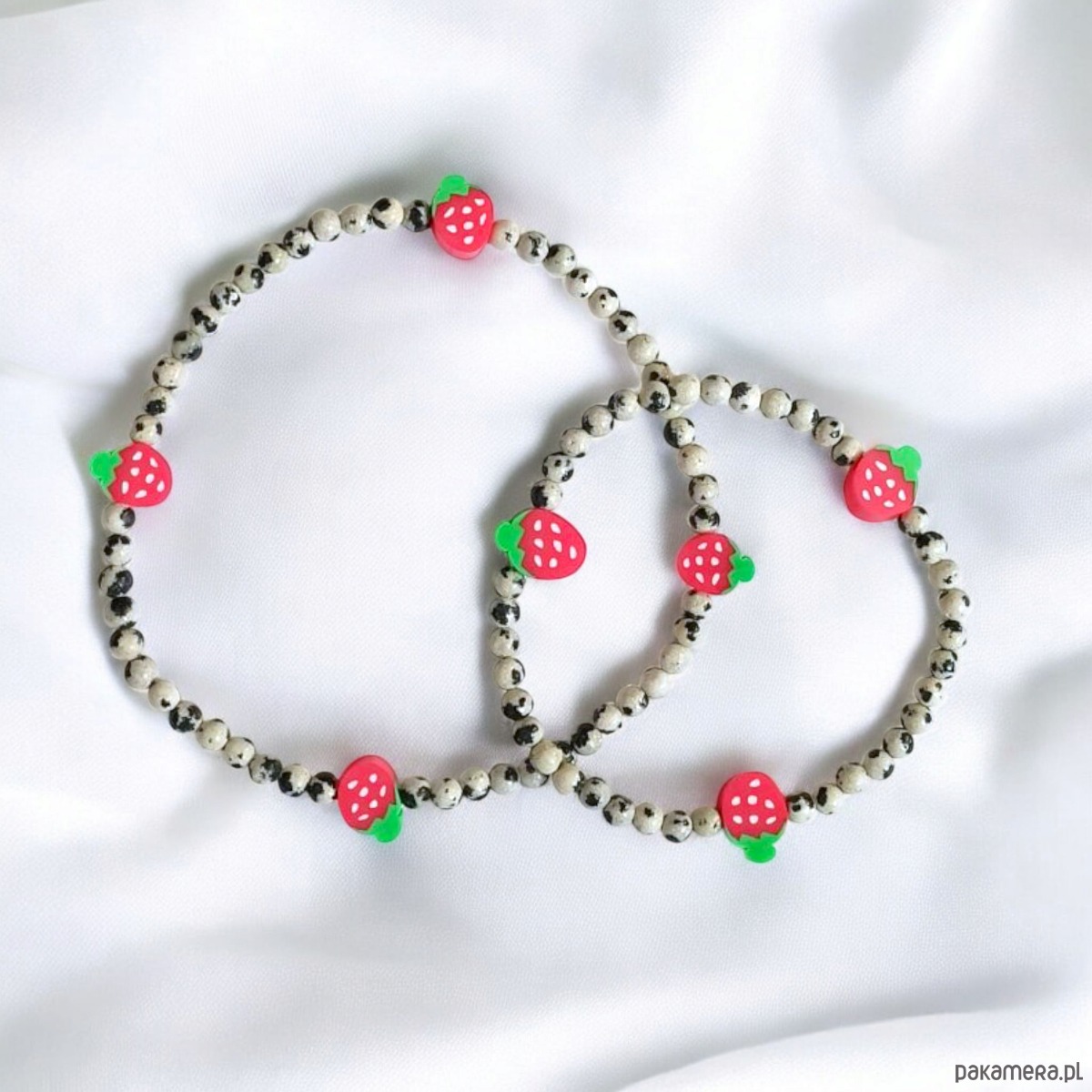 Urocze i niepoważne bransoletki na solidnej lince elastycznej, wykonana z jaspisu dalmatyńskiego (ok. 4mm) oraz truskawek z modeliny fimo.