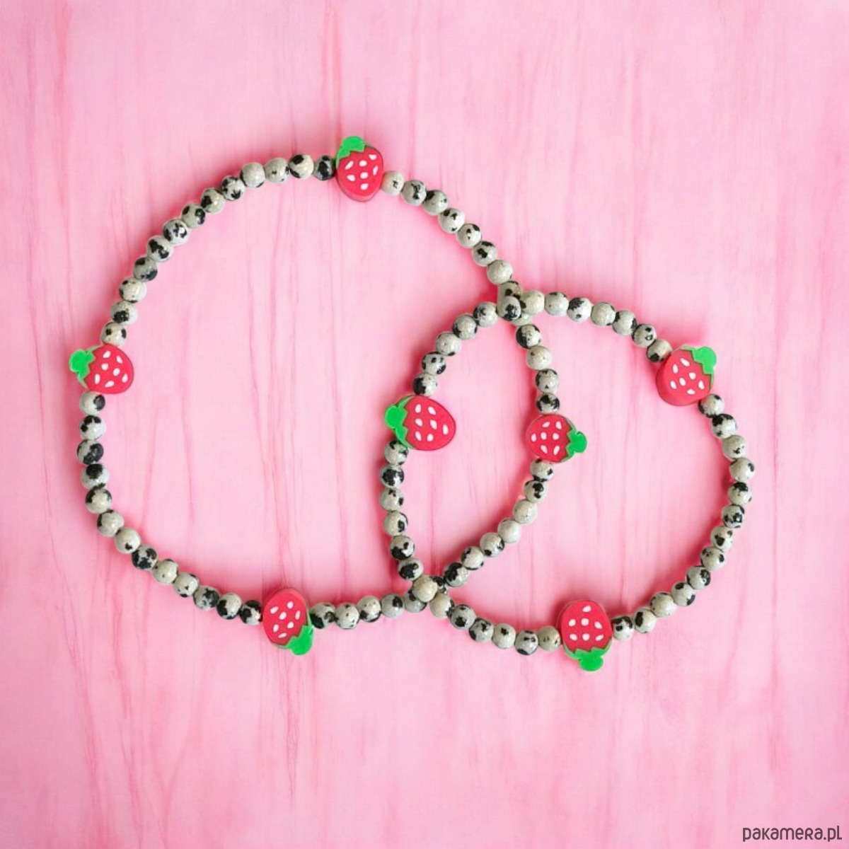 Urocze i niepoważne bransoletki na solidnej lince elastycznej, wykonana z jaspisu dalmatyńskiego (ok. 4mm) oraz truskawek z modeliny fimo.
