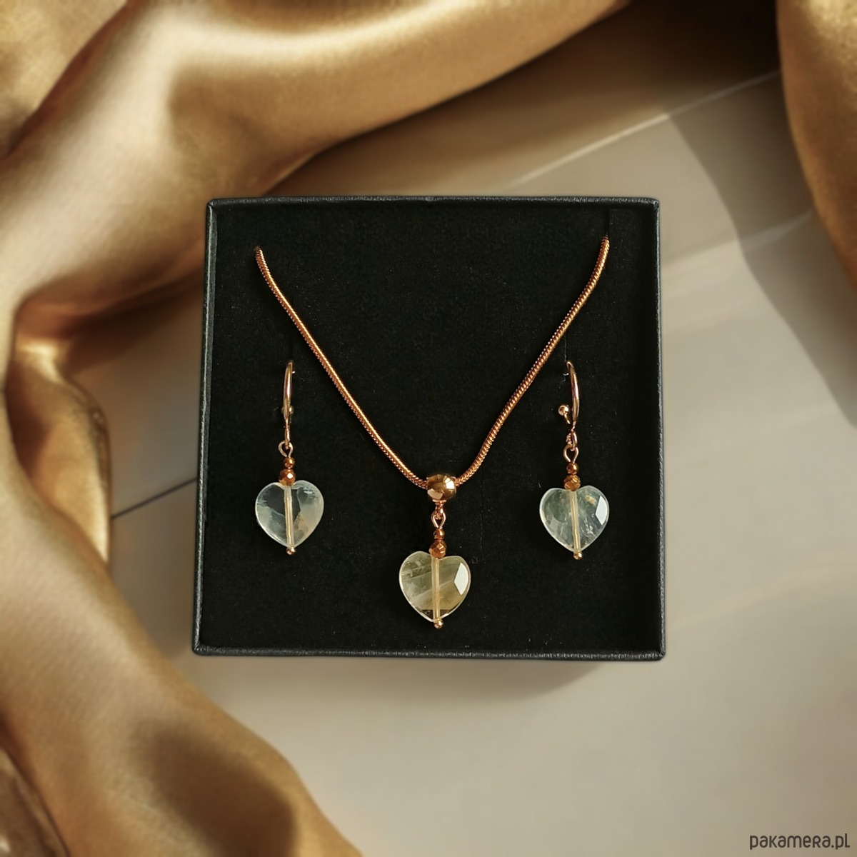 1) uroczy naszyjnik wykonany z fasetowanego serduszka z CYTRYN (barwa niejednolita) oraz przekładek ze złotego hematytu.