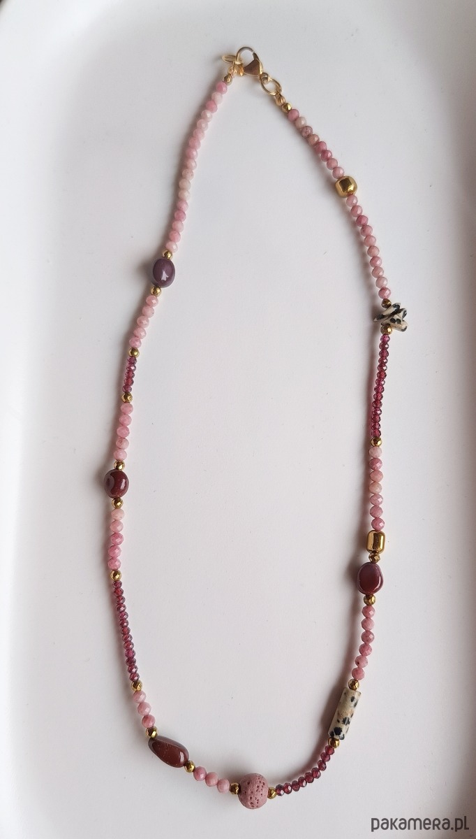 Naszyjnik z naturalnych kamieni rodonitu,burgundowego granatu,złotego hematytu,mokaitów i jaspisu dalmatynskiego