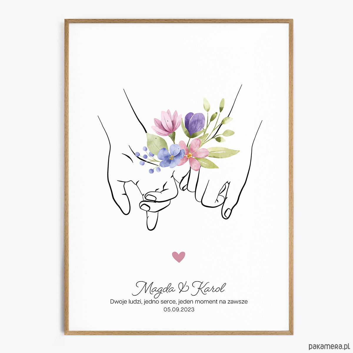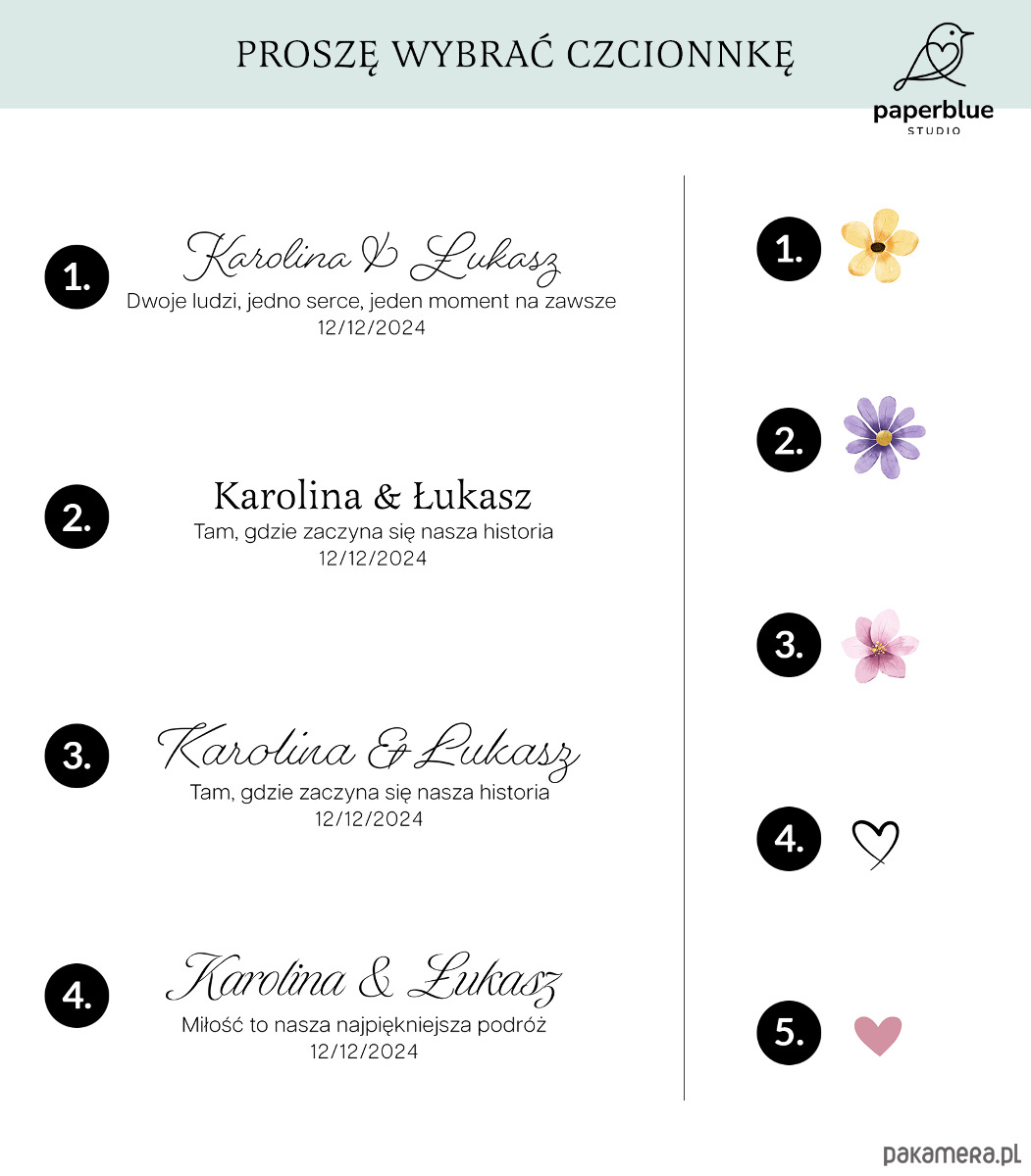 - Personalizacja imion, daty, nazwy miejsca lub cytatu (czcionki i ozdobniki przedstawione są w galerii produktu). Proszę napisać, czy nad imionami element np.serduszko.