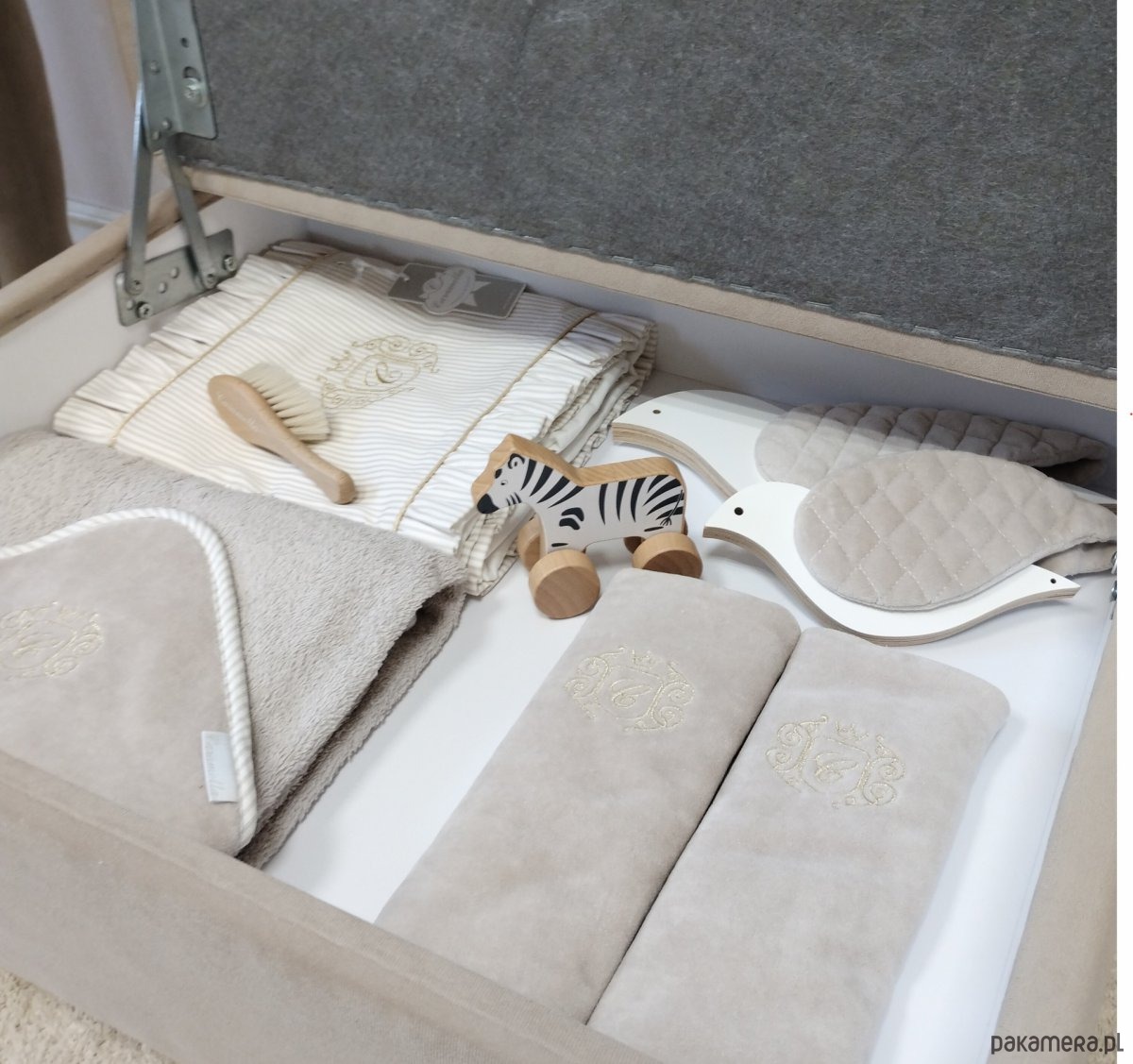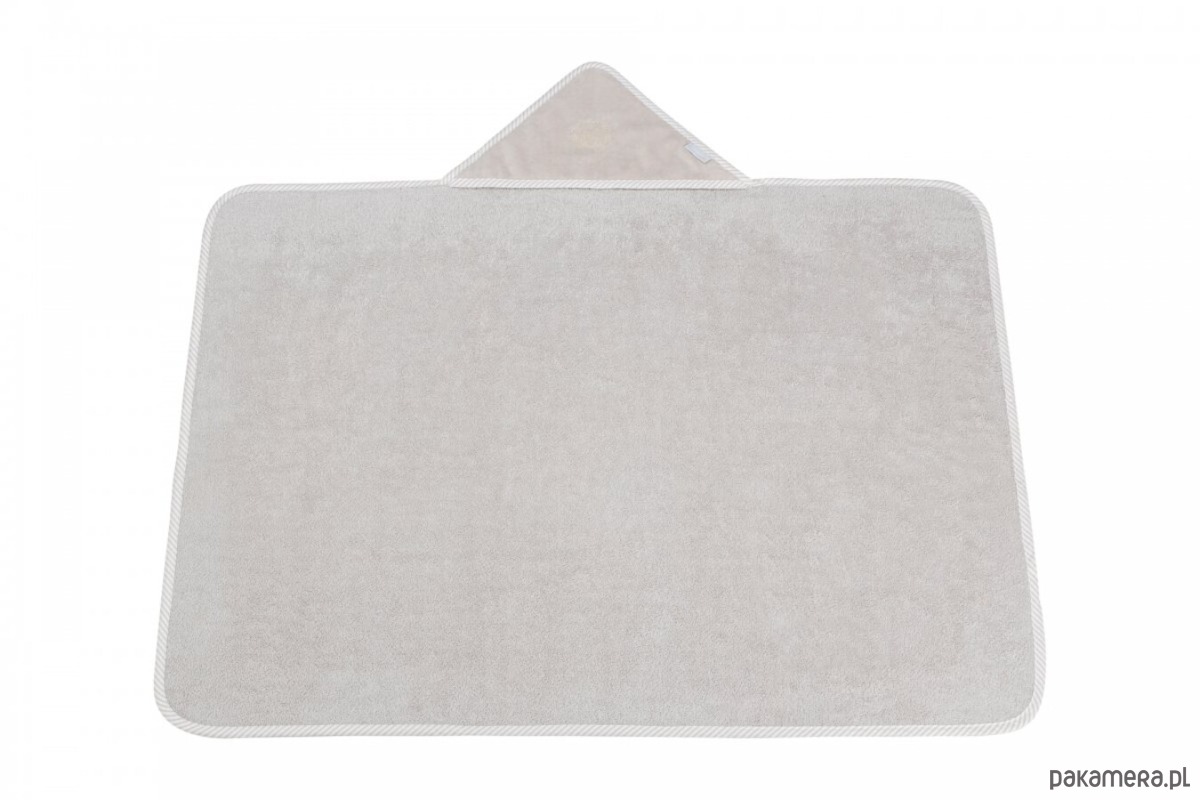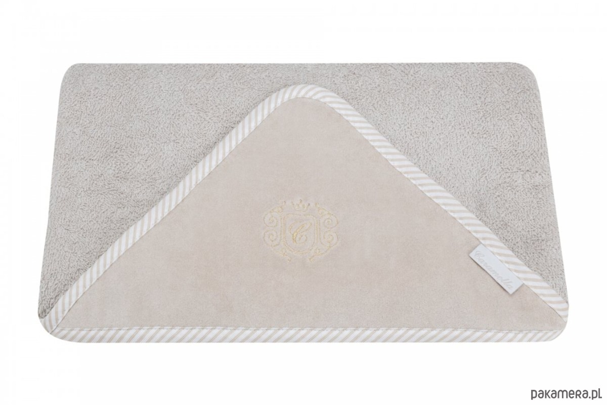 Elegancki ręczniczek uszyty z beżowej tkaniny frotte. Beżowy welurowy kapturek ozdobiony został eleganckim złotym emblematem. Rozmiar ręcznika jest większy niż ogólnie dostępnych na rynku. Nadaje się dla niemowlęcia oraz dla starszego dziecka, dlatego będzie Ci służył przez bardzo długi czas.