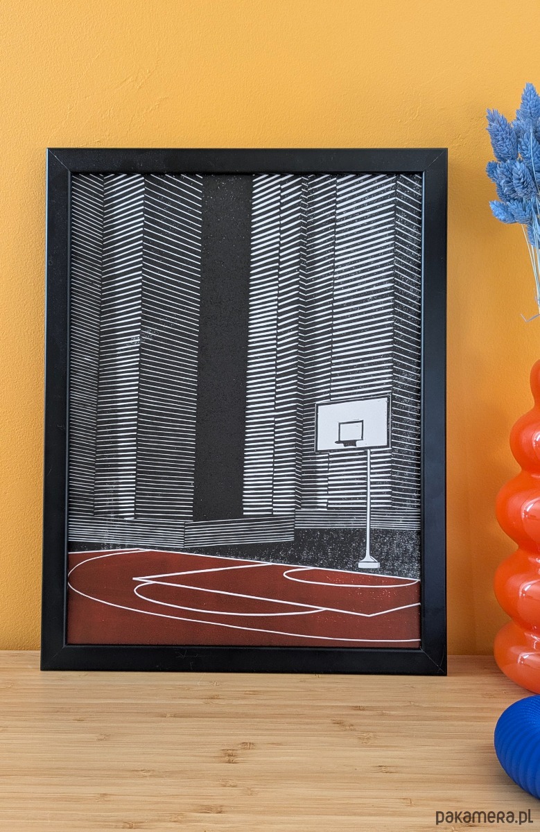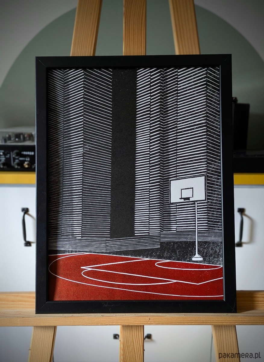 Ten linoryt to klasyka osiedlowych rozgrywek – minimal, beton, marzenia. Sąsiadki z bloku zamiast cheerleaderek i niewielkie boisko z wysłużonymi koszami zamiast Madison Square Garden. Propozycja idealna zarówno dla fanów koszykówki jak i dynamicznego, rytmicznego stylu w grafikach.
