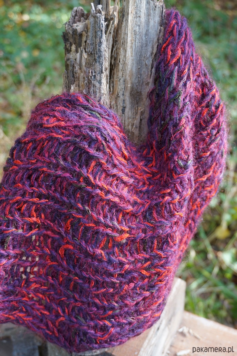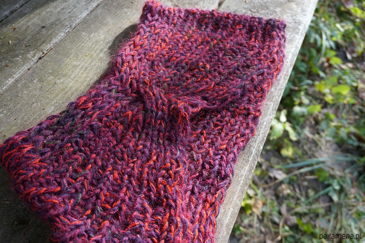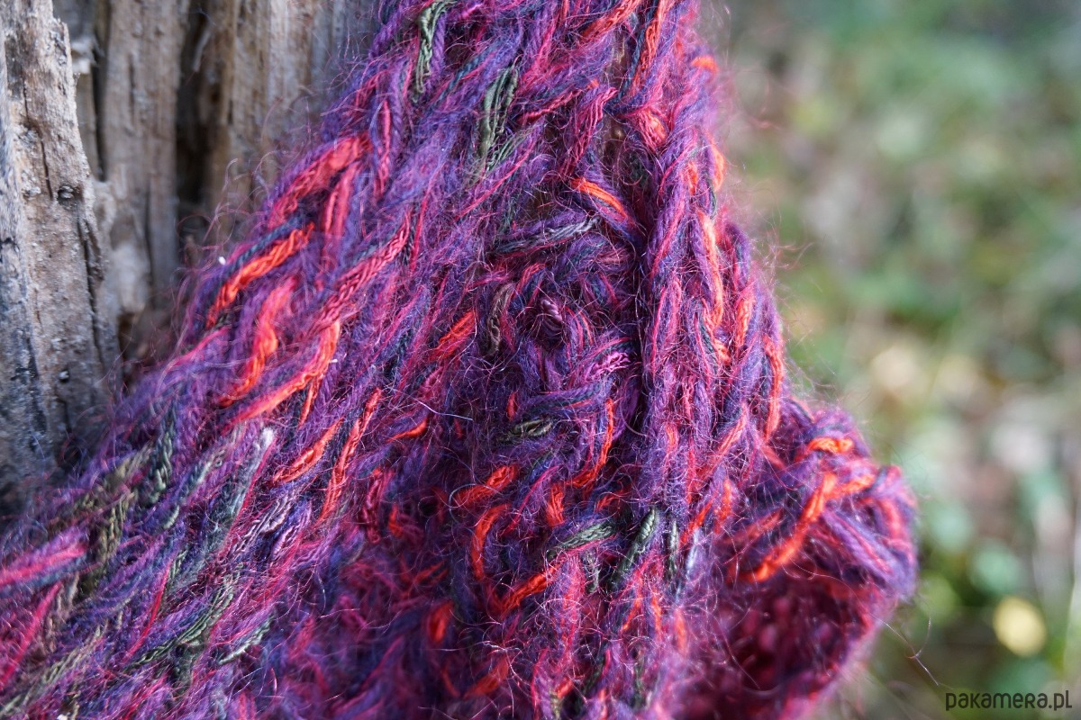 Ciepły i miękki komin w głębokich, bordowo-fioletowych odcieniach, o luźnym splocie. Ręcznie dziergany, ciepły i wygodny. Wyjątkowy zarówno pod względem koloru, jak i faktury.