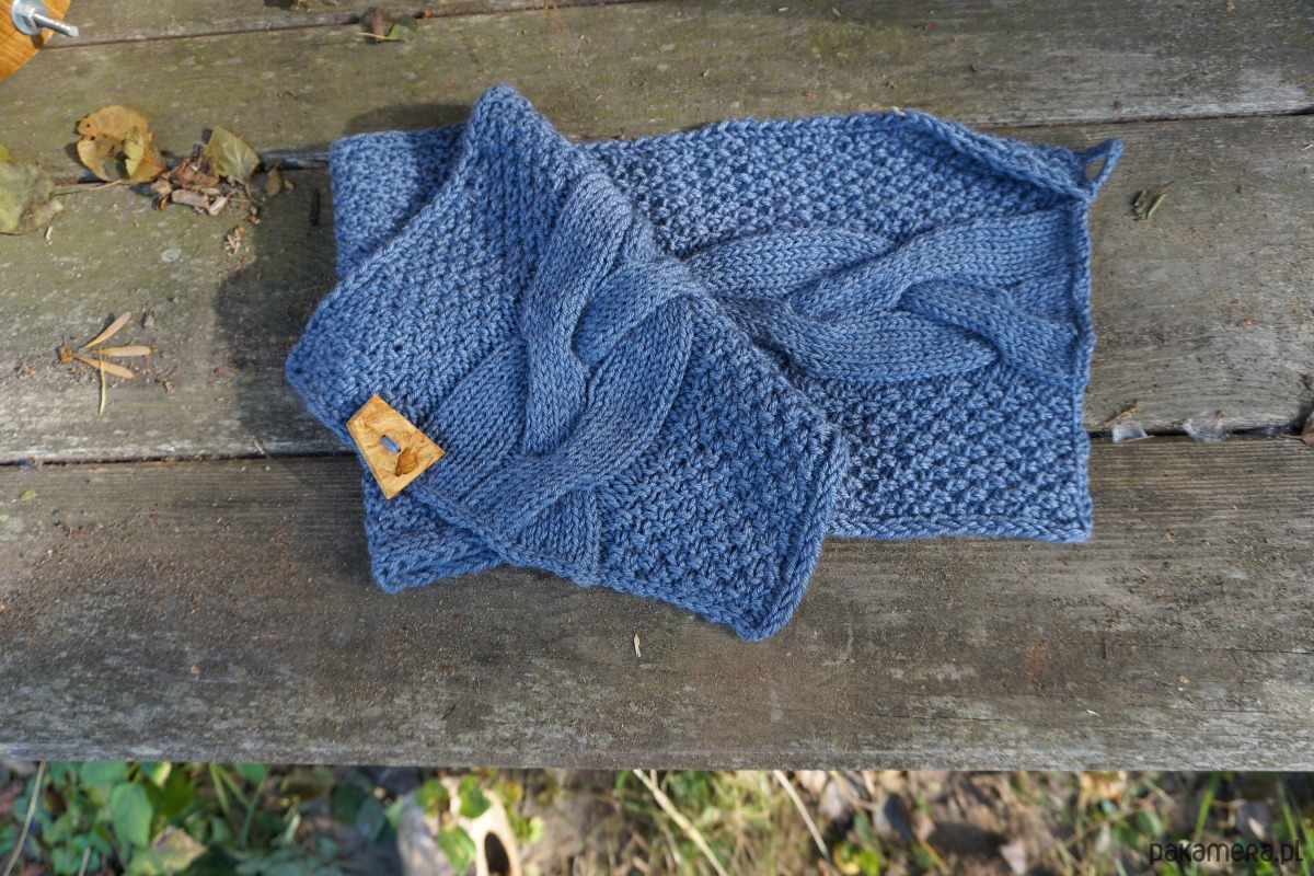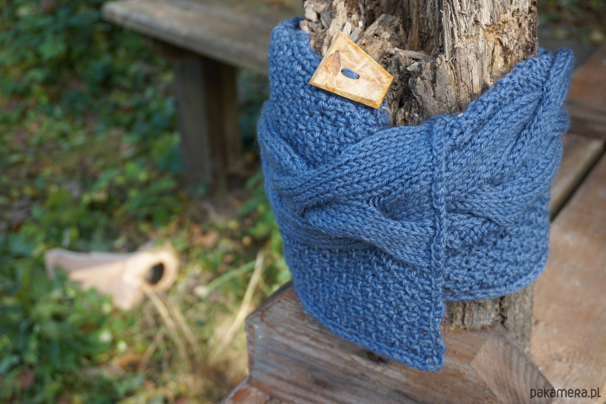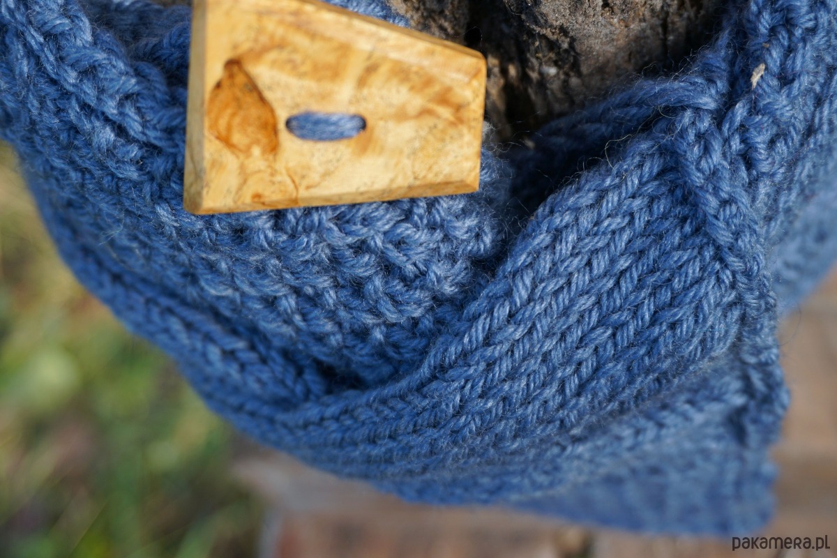 Ręcznie dziergany niebieski komin z warkoczem i guzikiem z drewna oliwnego