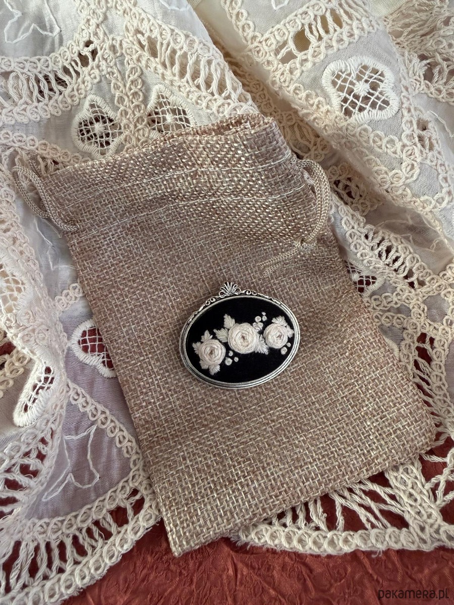 Broszka zapakowana w woreczek wykonany z juty.