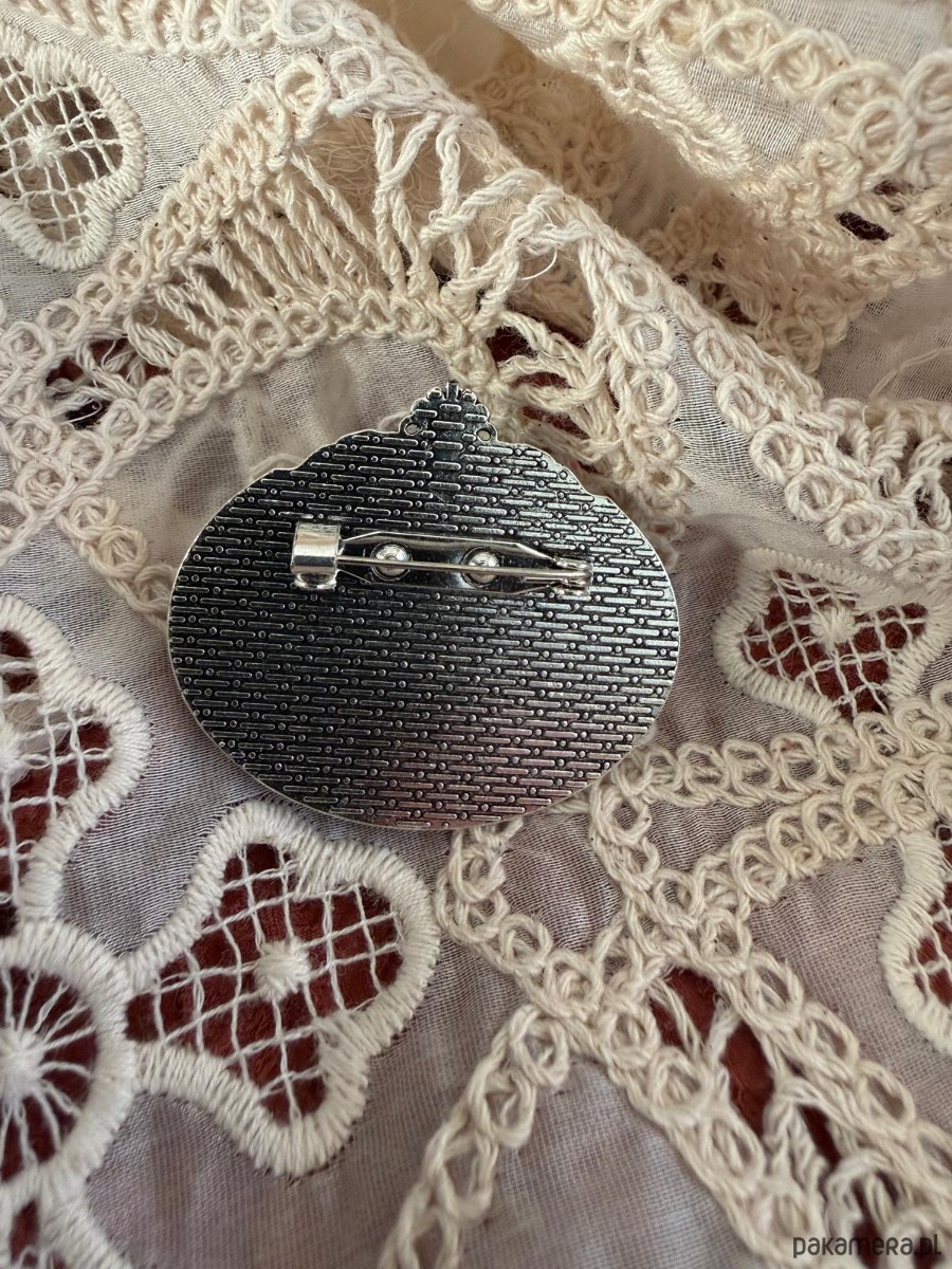 Wymiary broszki: 5 cm*4 cm, wymiary tarczy z haftem wysokość 4 cm, szerokość 3 cm.