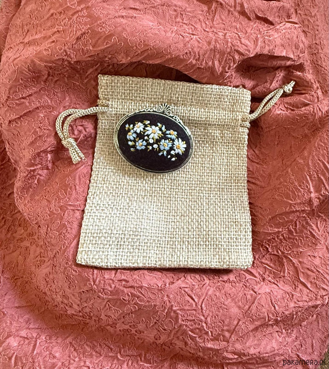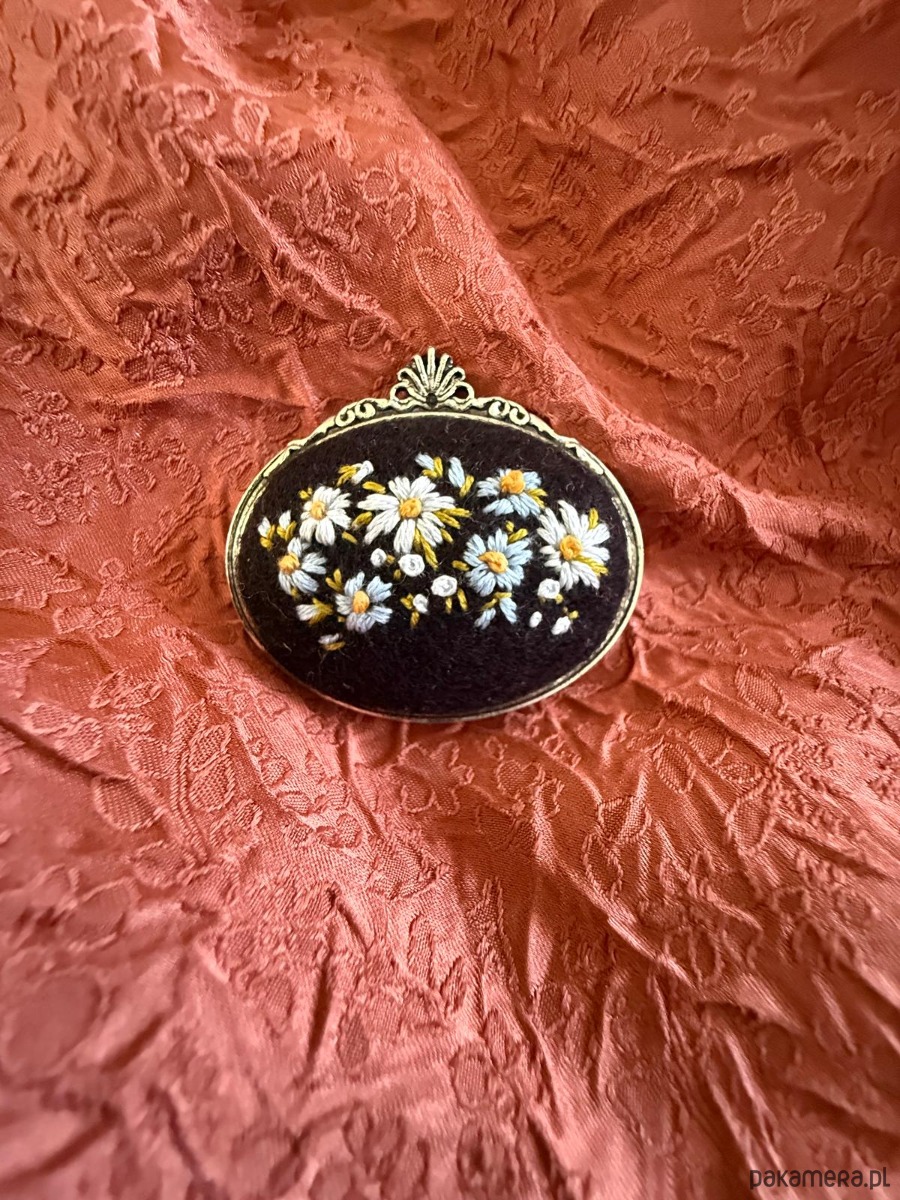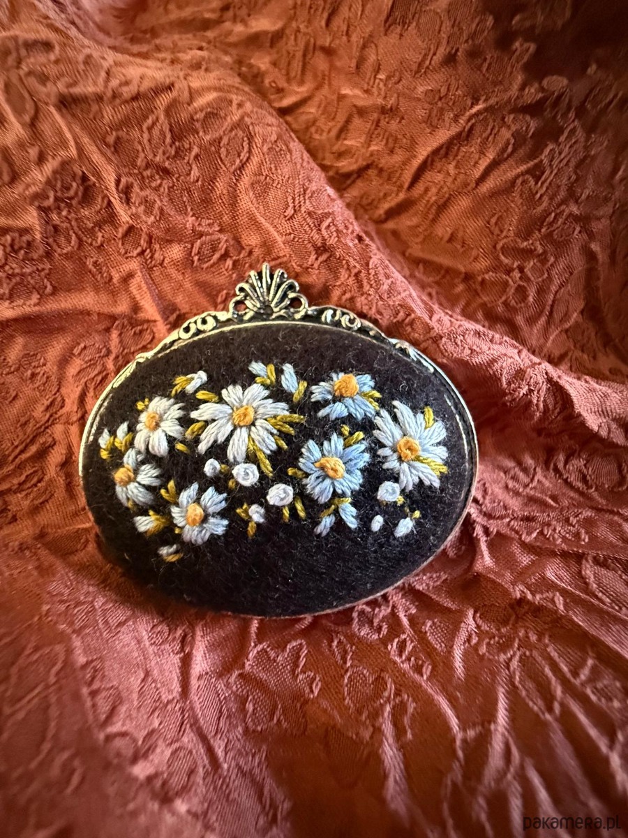 Ręcznie haftowana broszka "Stokrotki i niezapominajki"