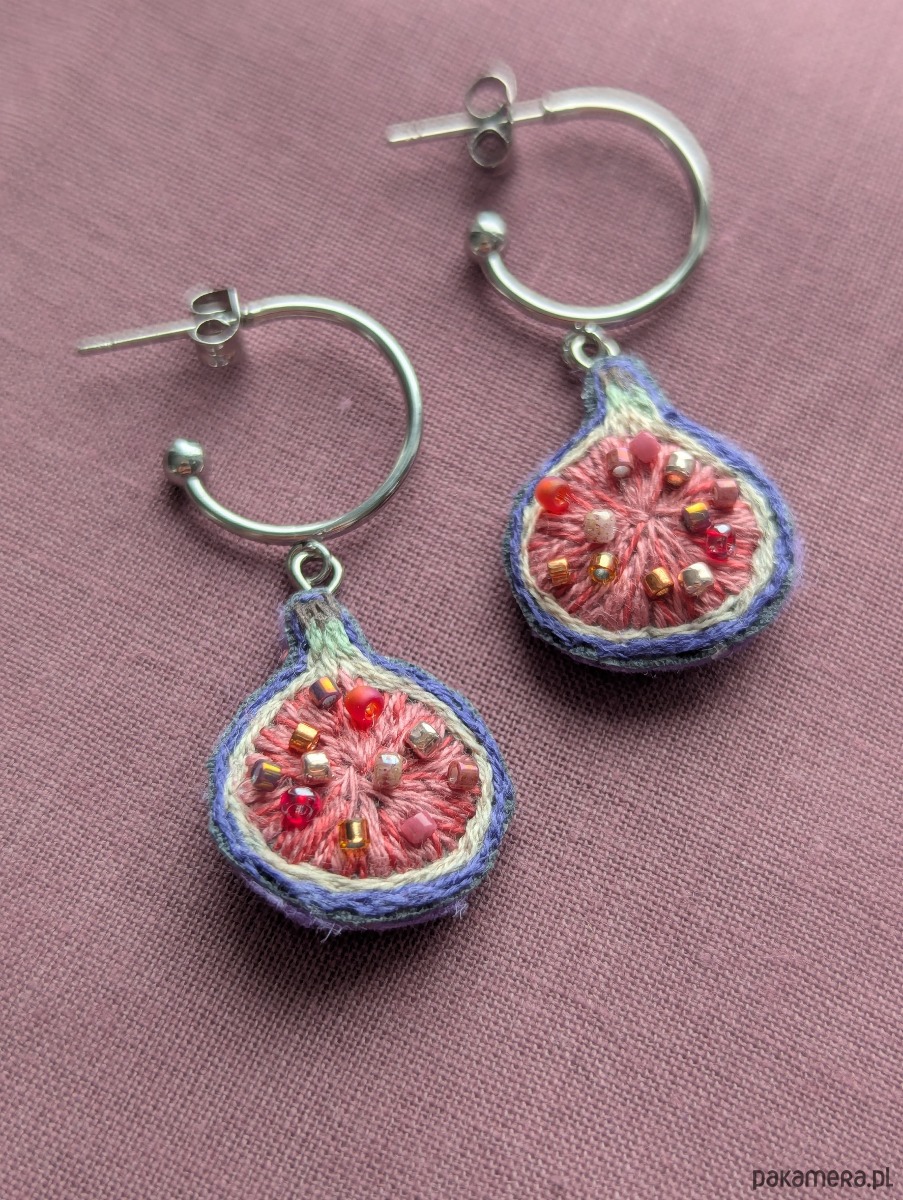 Ręcznie haftowane kolczyki w kształcie fig, ozdobione różnokolorowymi szklanymi koralikami. Małe, słodkie i pełne detalu - przyciągają wzrok subtelnym blaskiem i fakturą. Delikatne, ale z charakterem - idealne dla miłośniczek owocowych akcentów 🍇✨