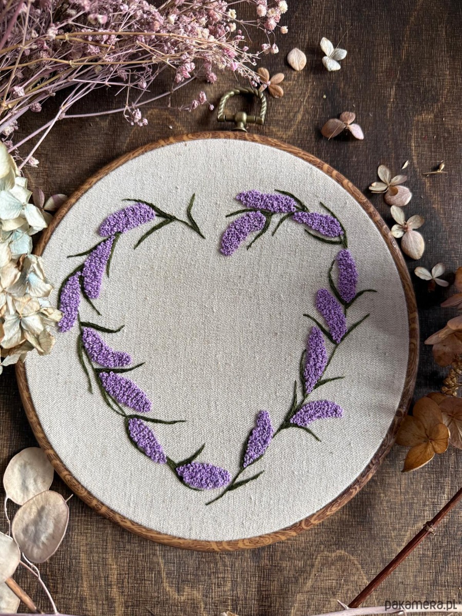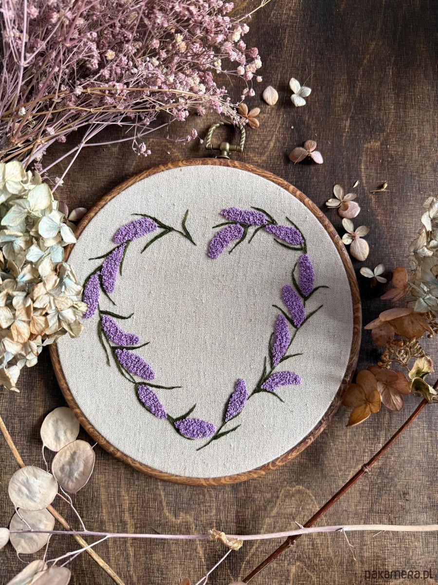 Ręcznie haftowany obrazek "Serce z kwiatów - dziki bez "