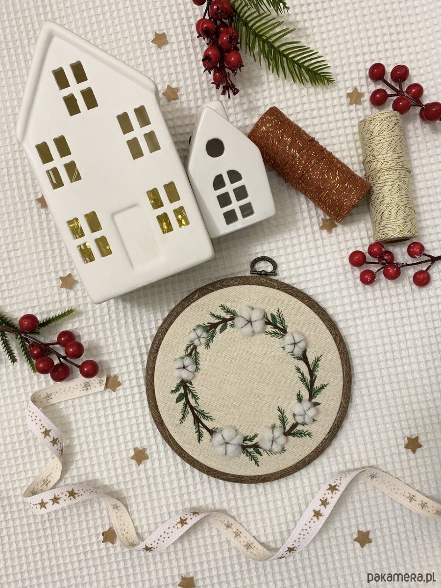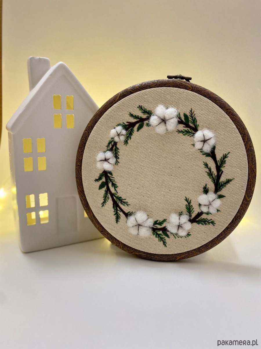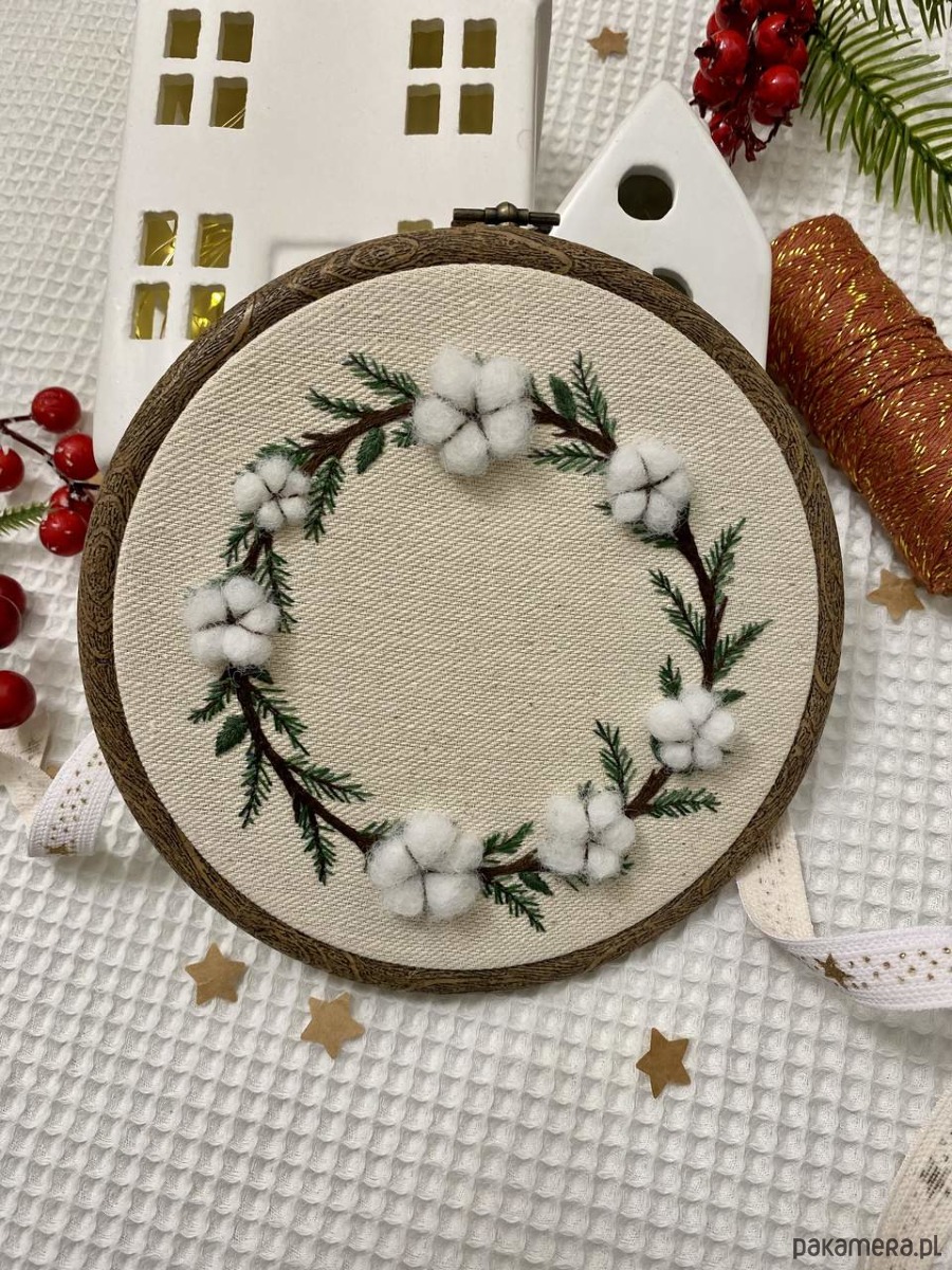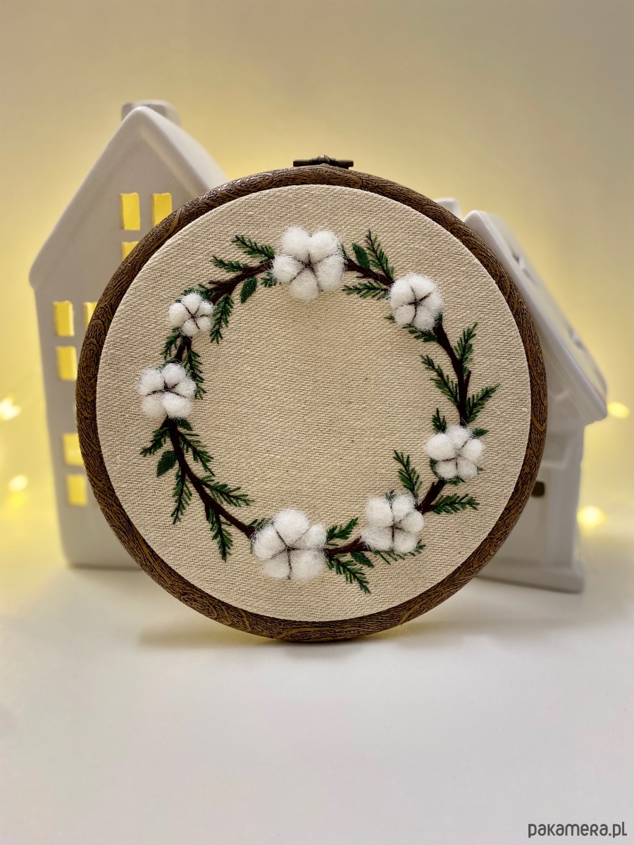 Niebanalny haftowany wianek na Boże Narodzenie w stylu rustykalnym z puszystymi kwiatami bawełny. Wyhaftowane gałązki świerku idealnie wpisują się w klimat Świąt Bożego Narodzenia.