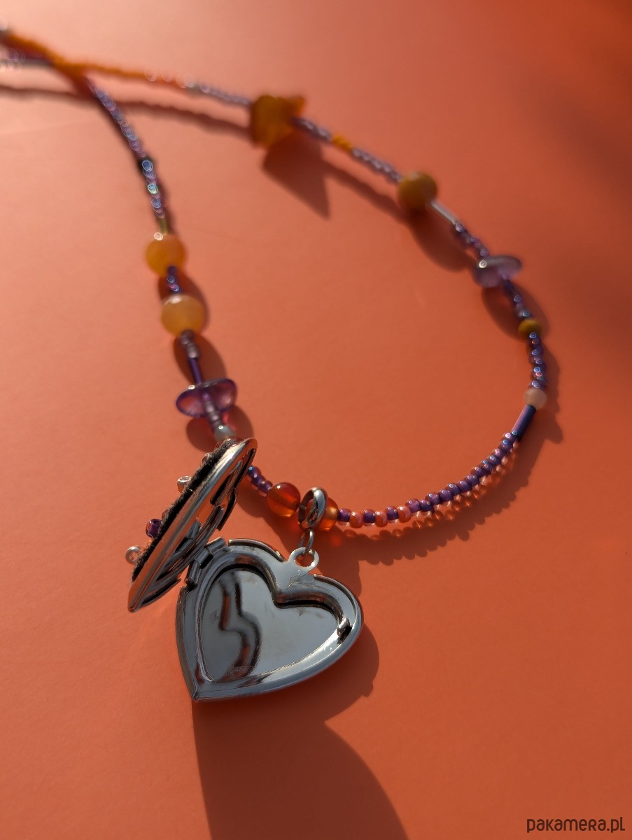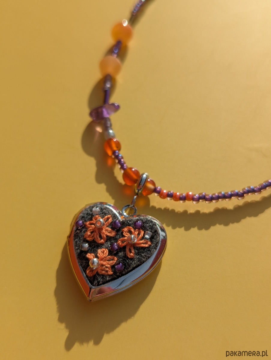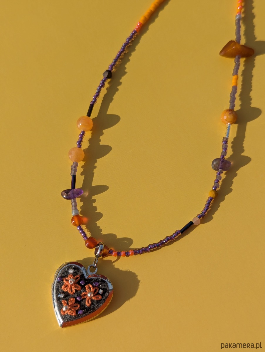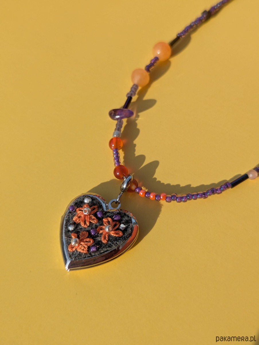 Specjalizuję się w hafcie ręcznym i to właśnie on jest sercem mojej twórczości. Tym razem postanowiłam połączyć moją miłość do haftu z fascynacją koralikami oraz kamieniami naturalnymi. Ręcznie wyhaftowane kwiaty na serduszku-sekretniku spotykają się tu z intuicyjnie nawlekanymi kamieniami i szklanymi koralikami