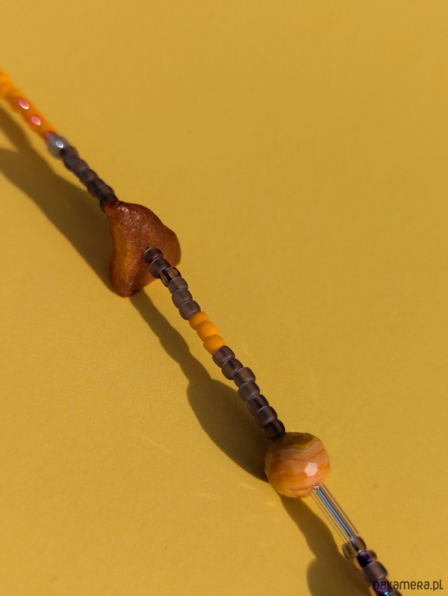 Użyte kamienie: jaspisy, agaty, bursztyn, hematyt, kamień rzeczny, ametyst, spinel