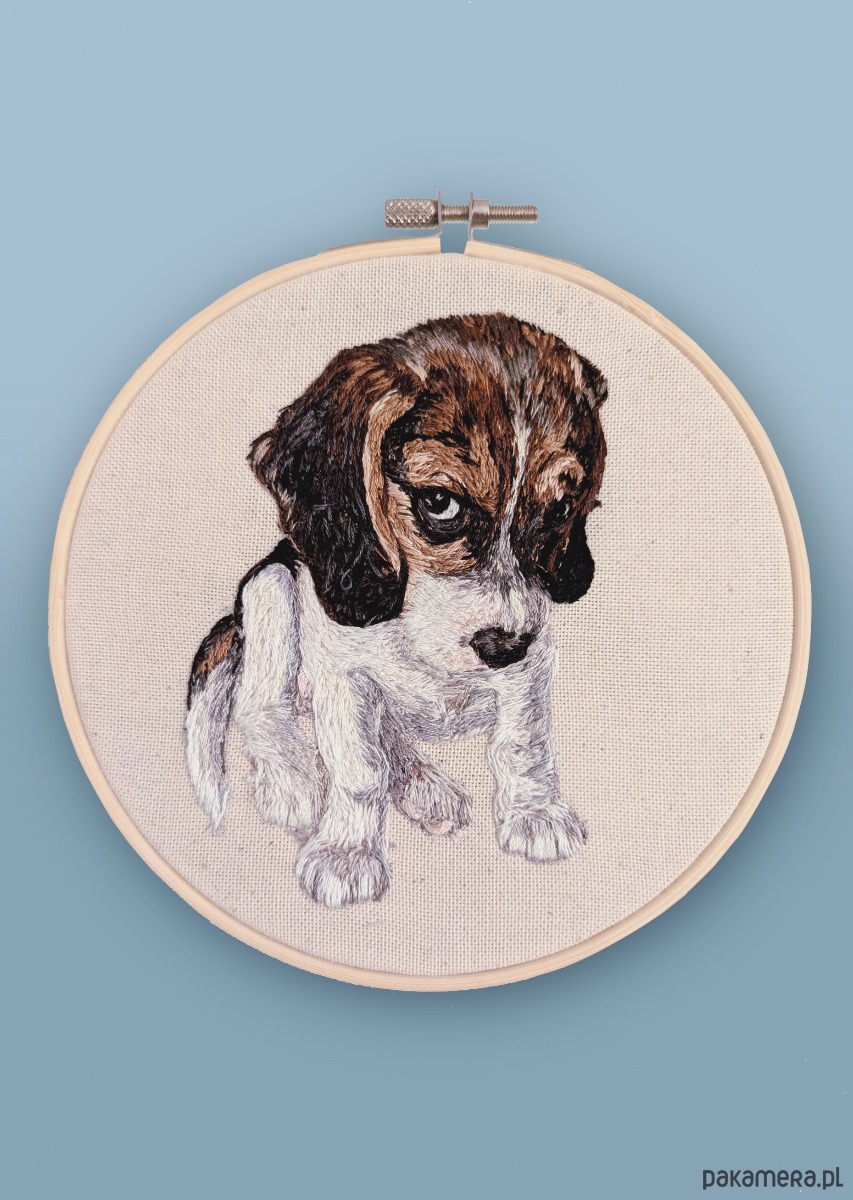Dodaj wyjątkowego uroku swojemu wnętrzu dzięki unikatowemu, ręcznie haftowanemu portretowi psa – Beagle. Ta urocza ozdoba została starannie wykonana na surowej bawełnie i oprawiona w prosty bambusowy tamborek o średnicy 15 cm.