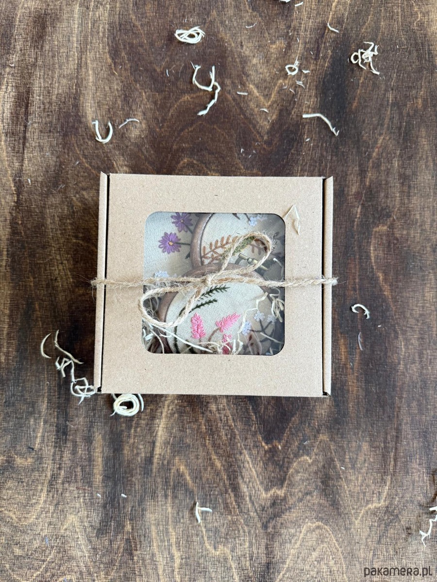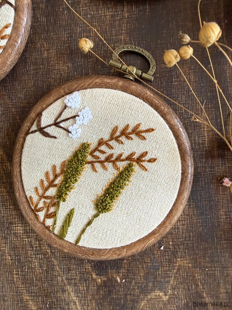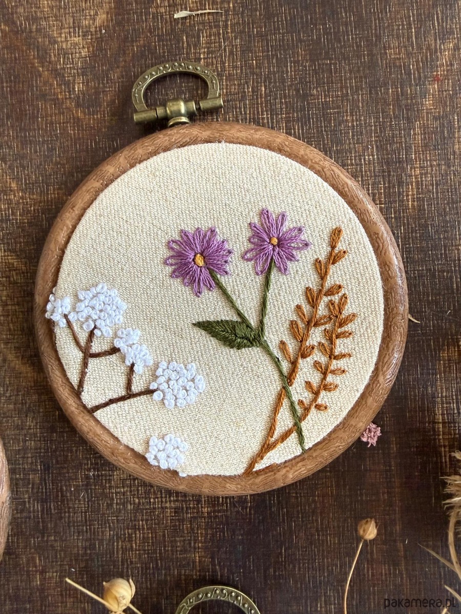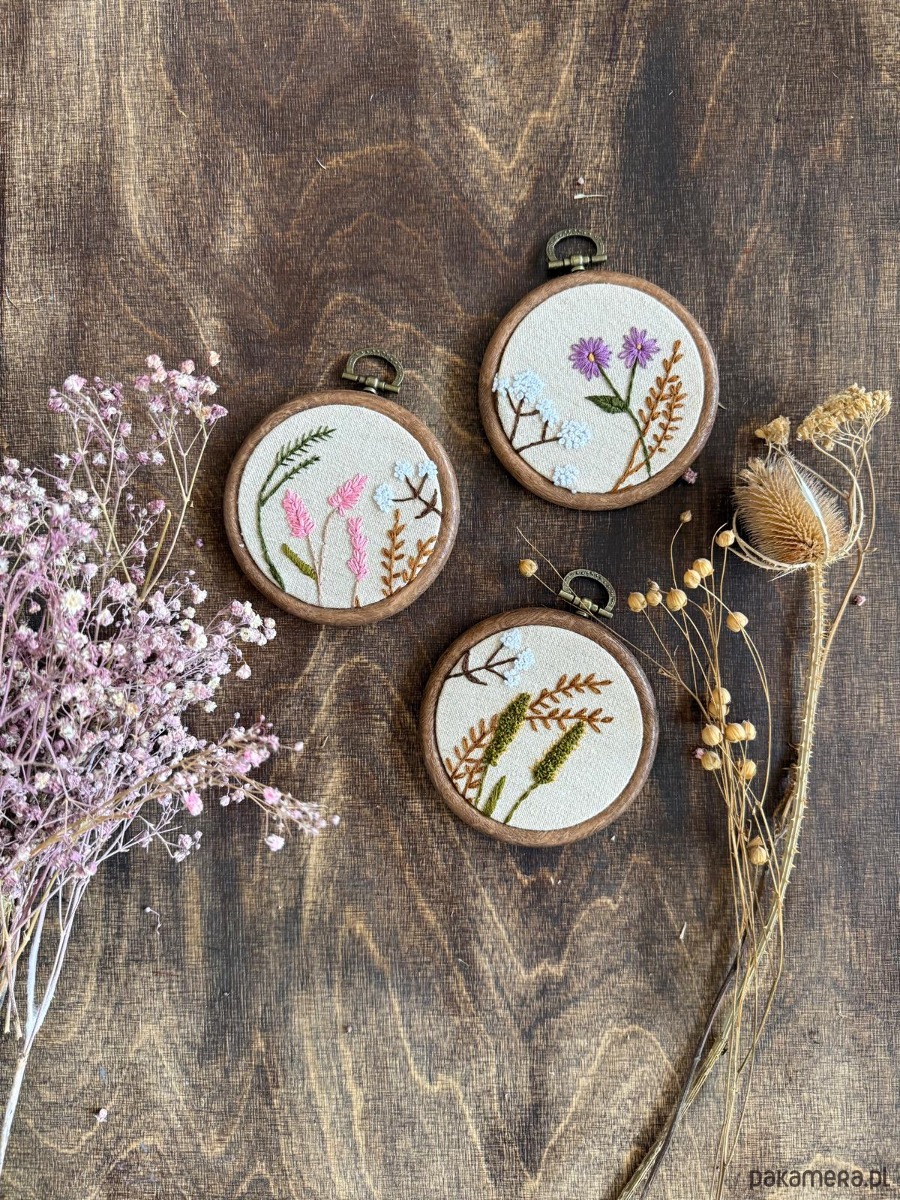 Wymiary większego tamborka: średnica 9 cm, długość uchwytu 2 cm.