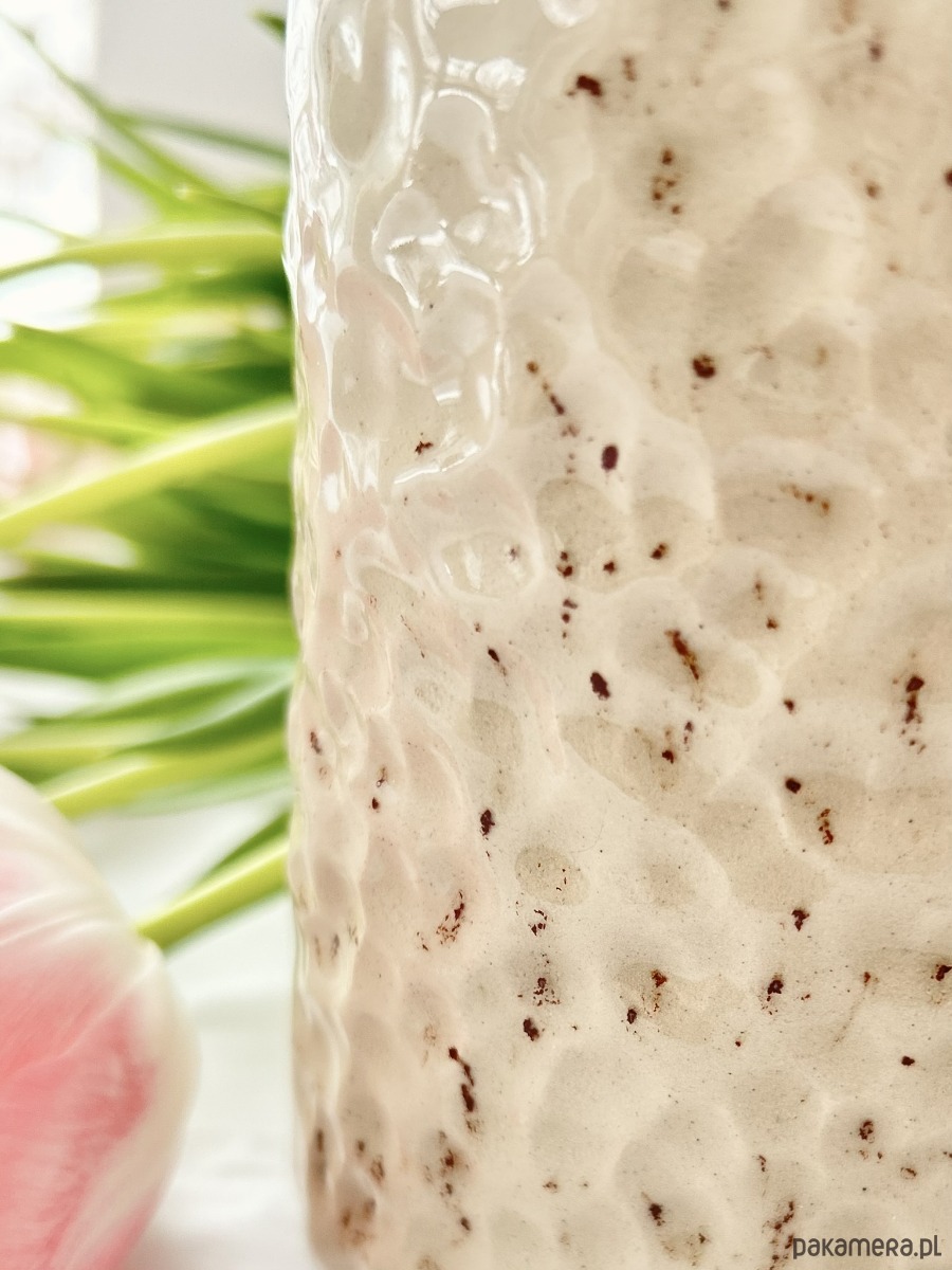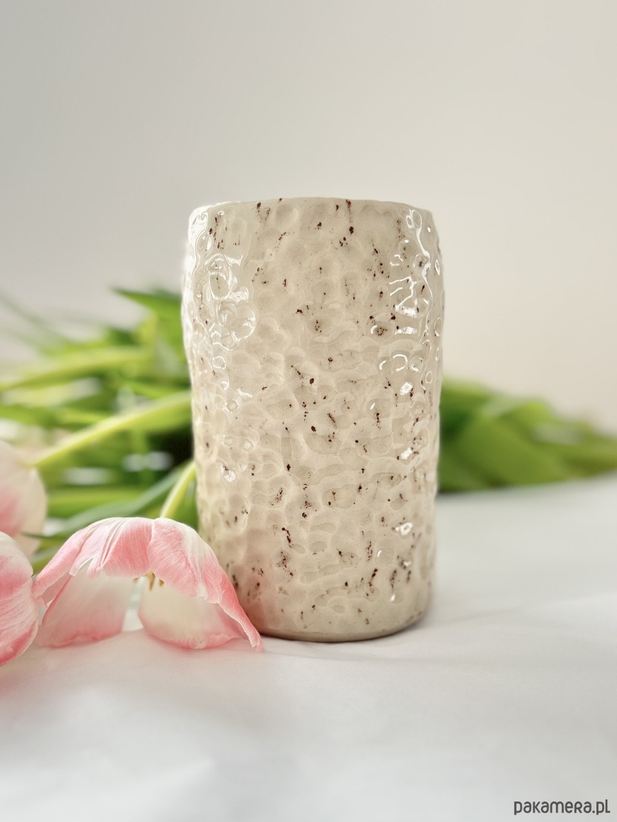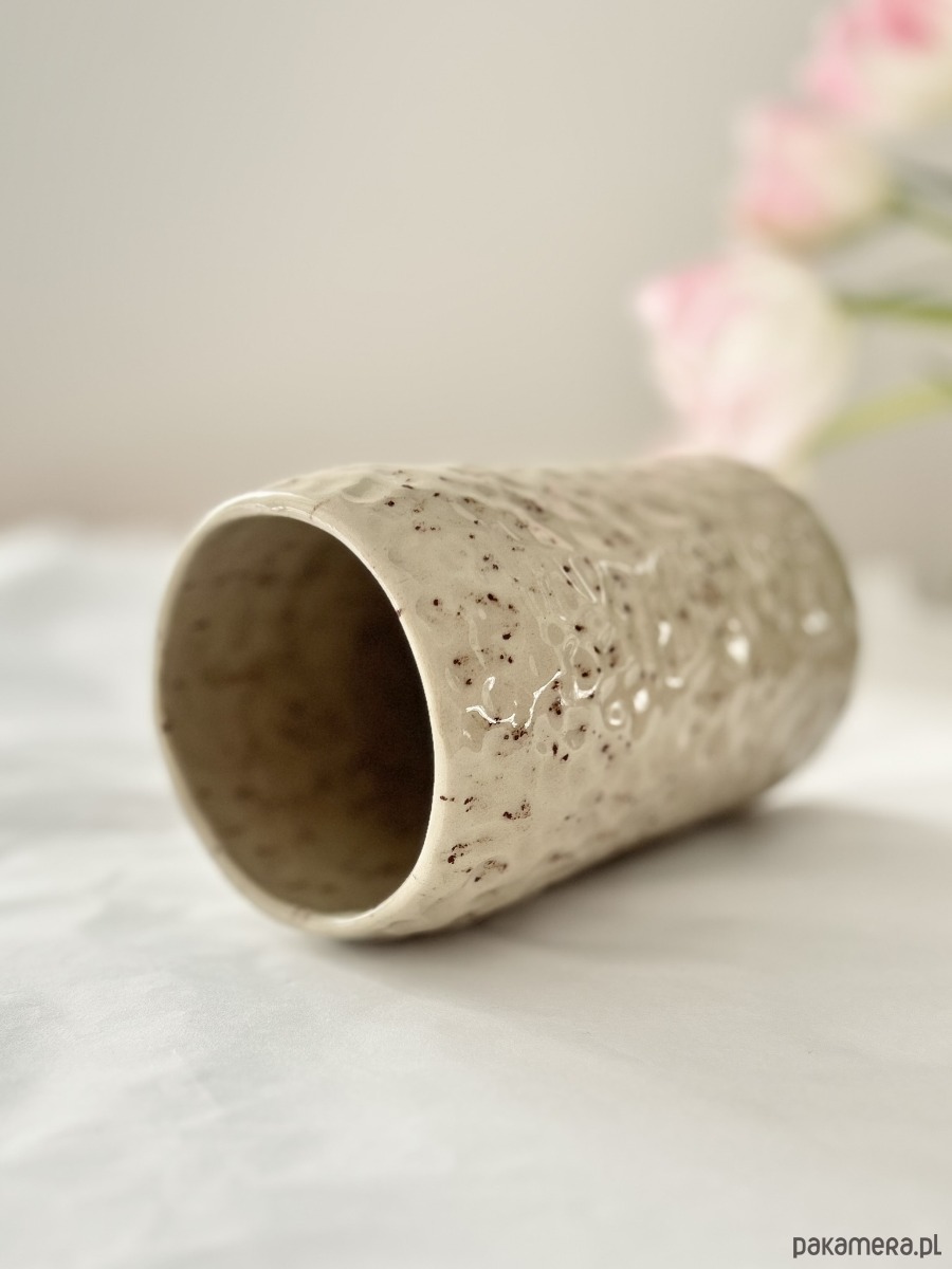 Pokryty beżowym nakrapianym szkliwem, które subtelnie podkreśla strukturę gliny i nadaje powierzchni naturalną głębię. Każdy egzemplarz powstaje indywidualnie, bez użycia form, dzięki czemu zachowuje swój unikatowy charakter.
