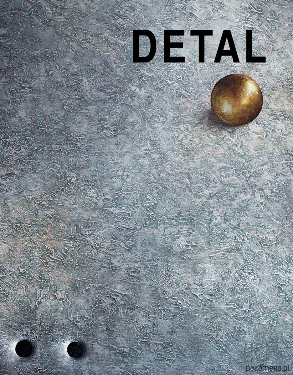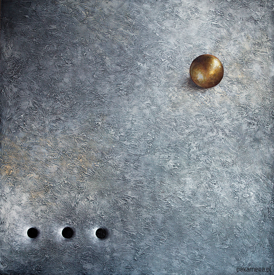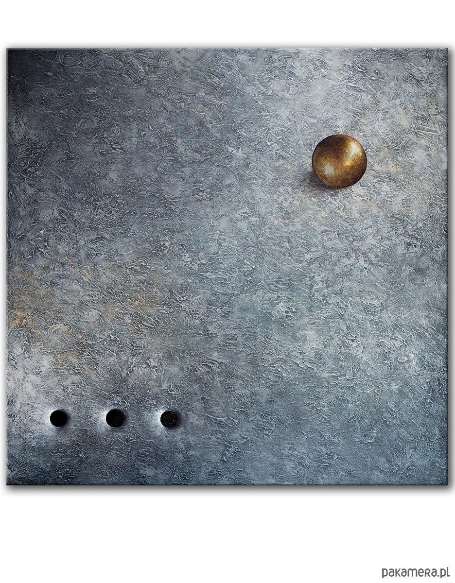 Kompozycja to szara abstrakcja z wyrazistą strukturą farby i realistycznymi elementami, tworzącymi efekt 3D
