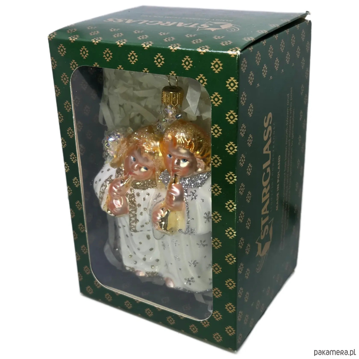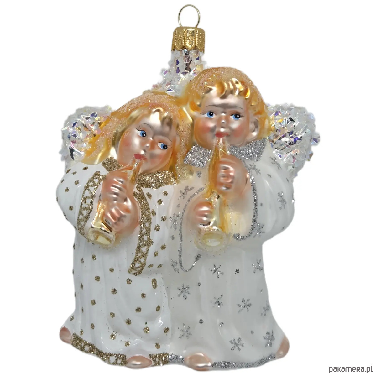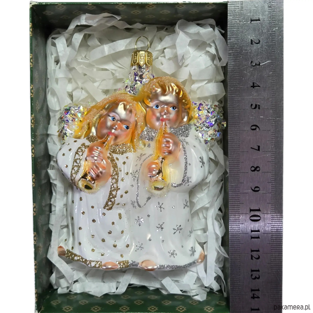 Ręcznie malowana bombka szklana białe aniołki z fletami zdobione brokatem