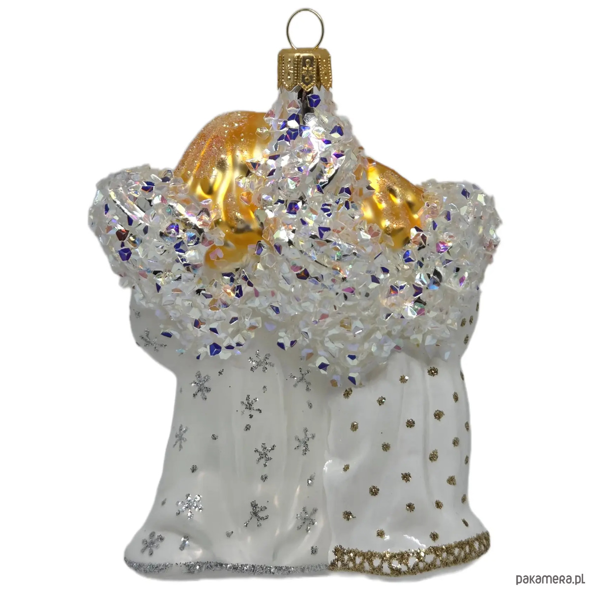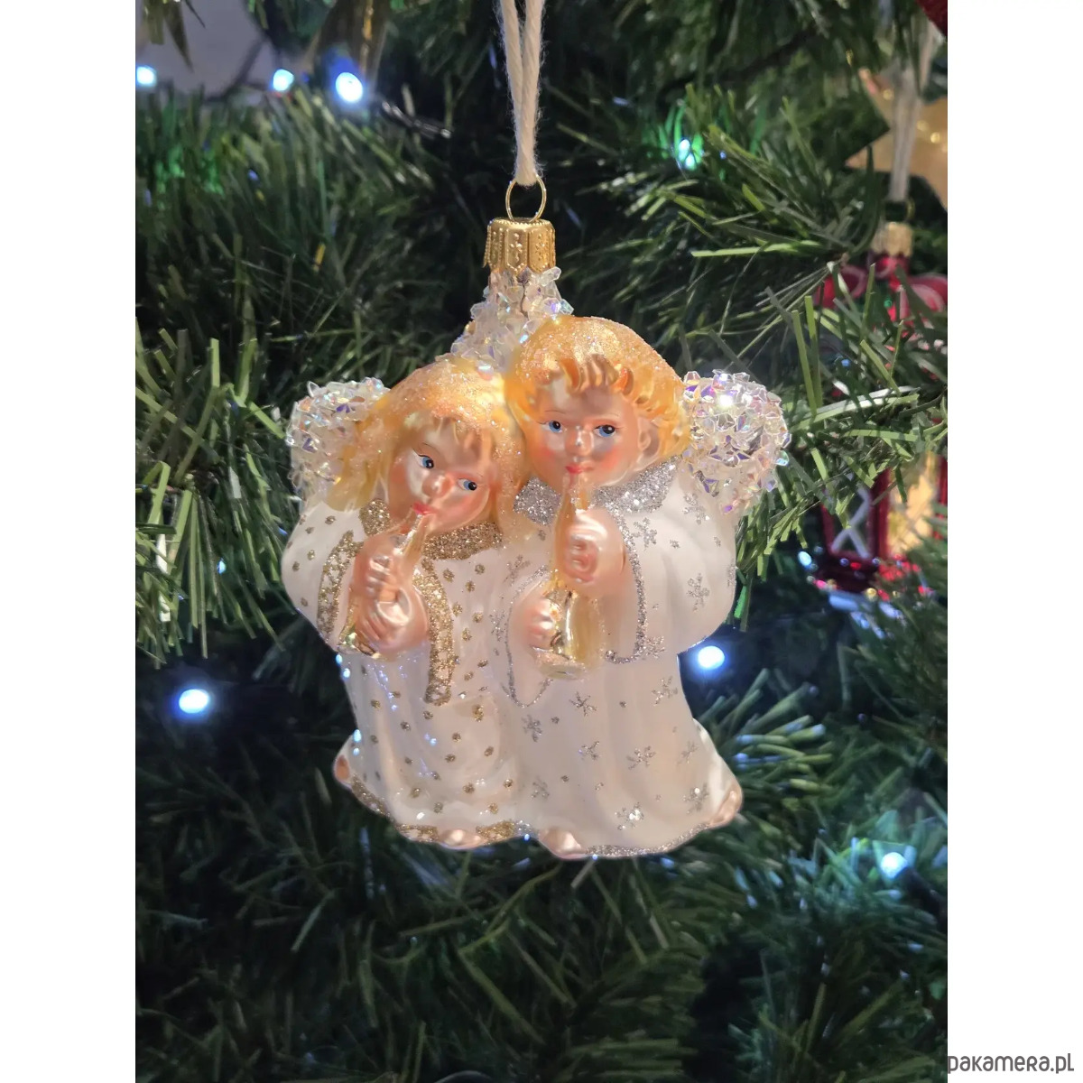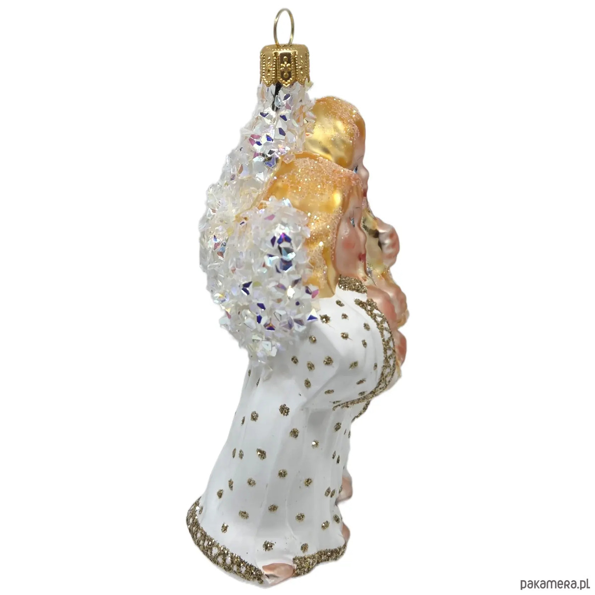 Ręcznie malowana bombka szklana białe aniołki z fletami zdobione brokatem
