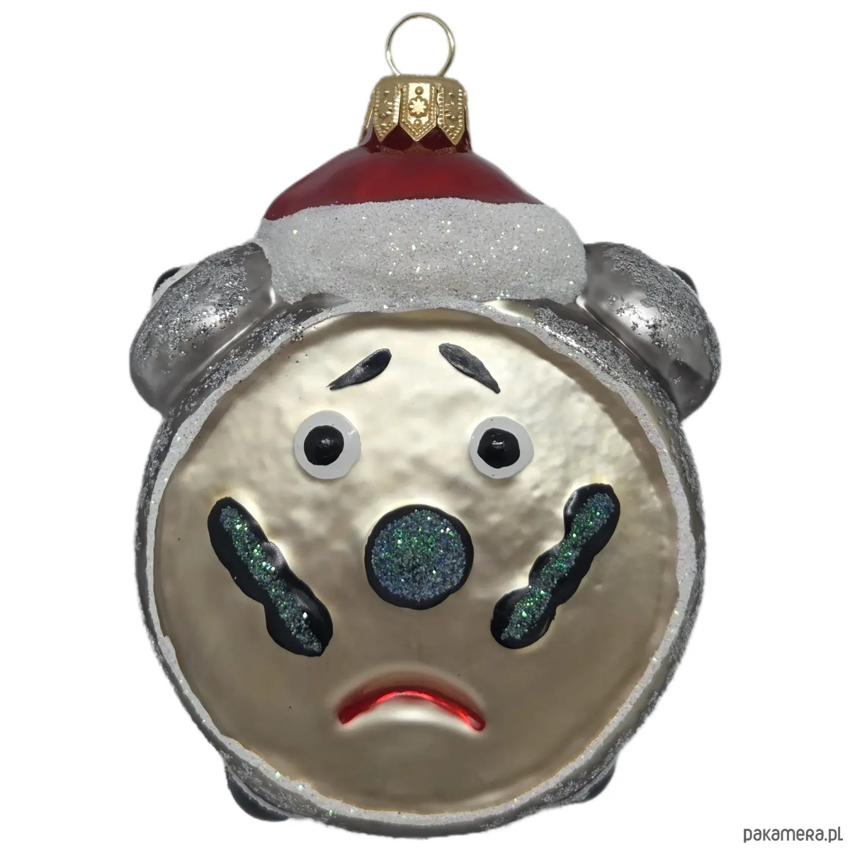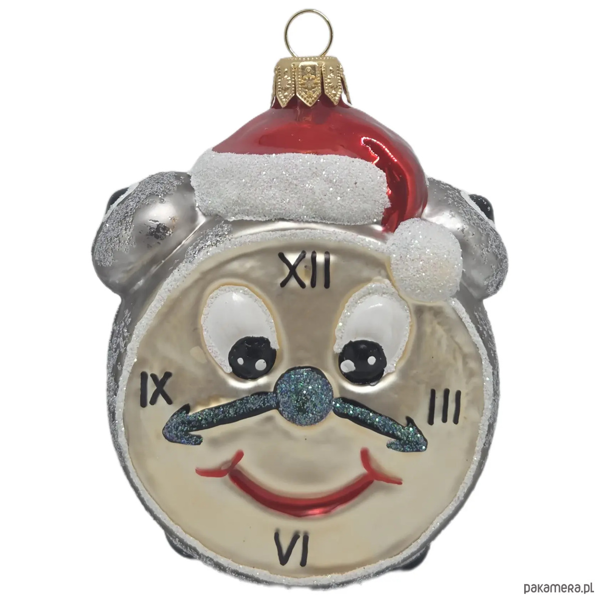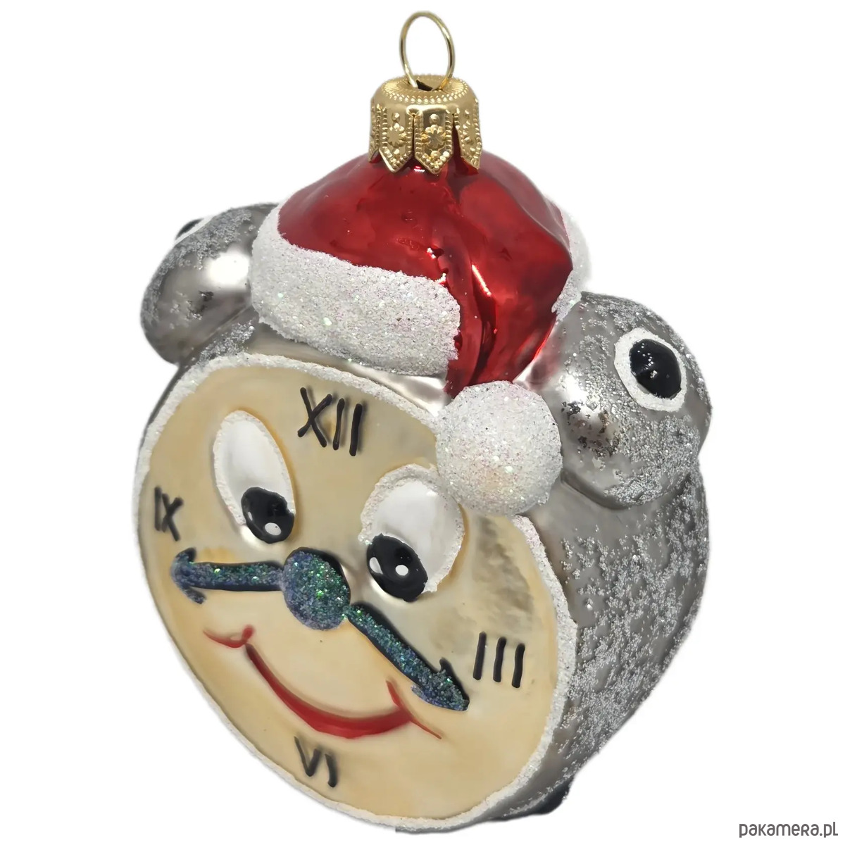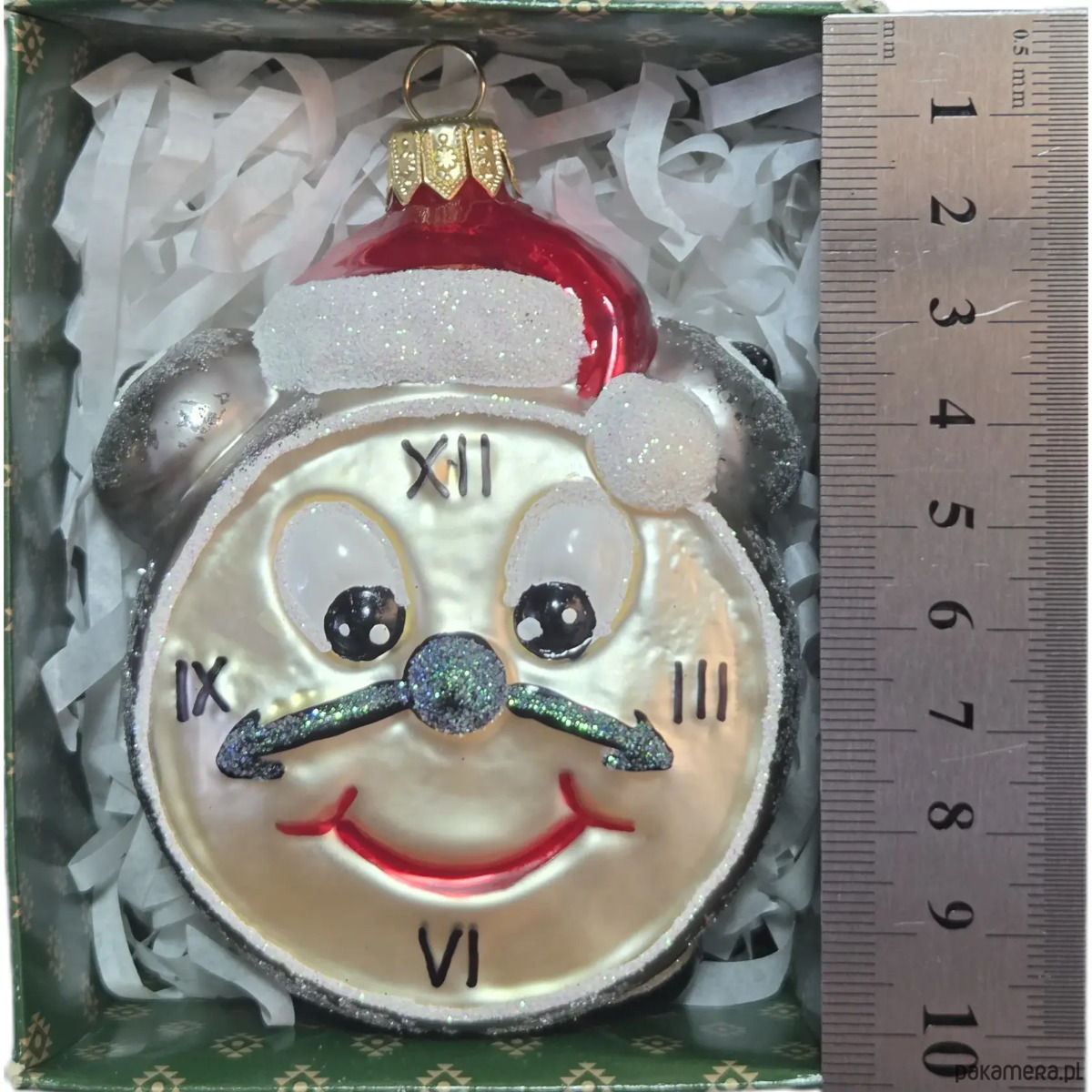 Ręcznie malowana bombka szklana srebrny bajkowy zegar w czapce Mikołaja