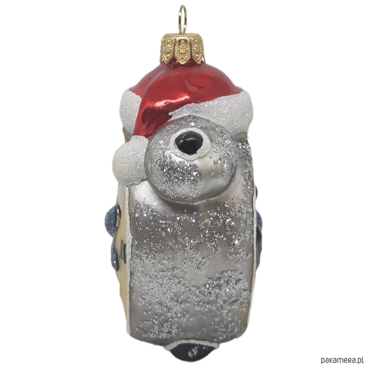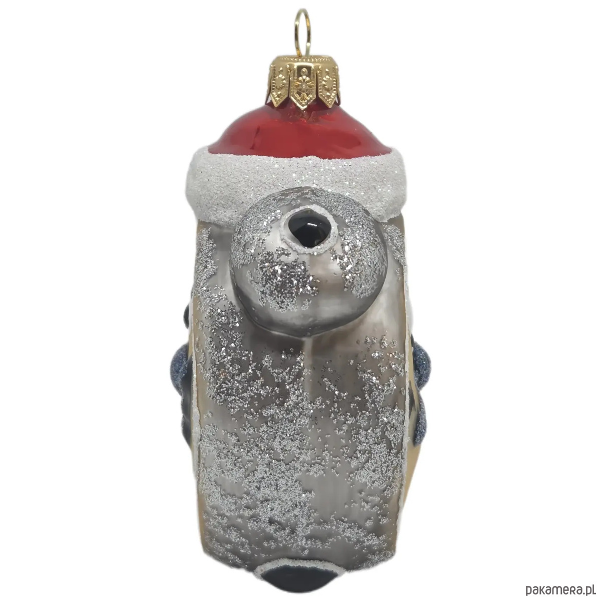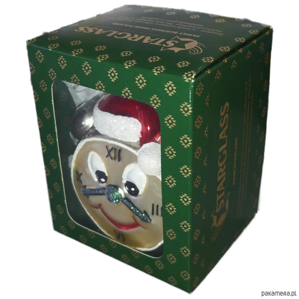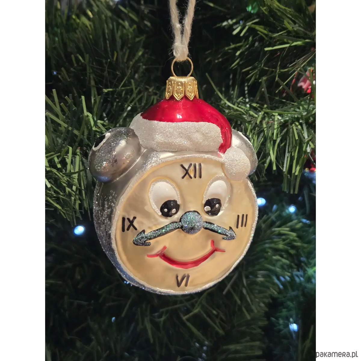 Ręcznie malowana bombka szklana srebrny bajkowy zegar w czapce Mikołaja