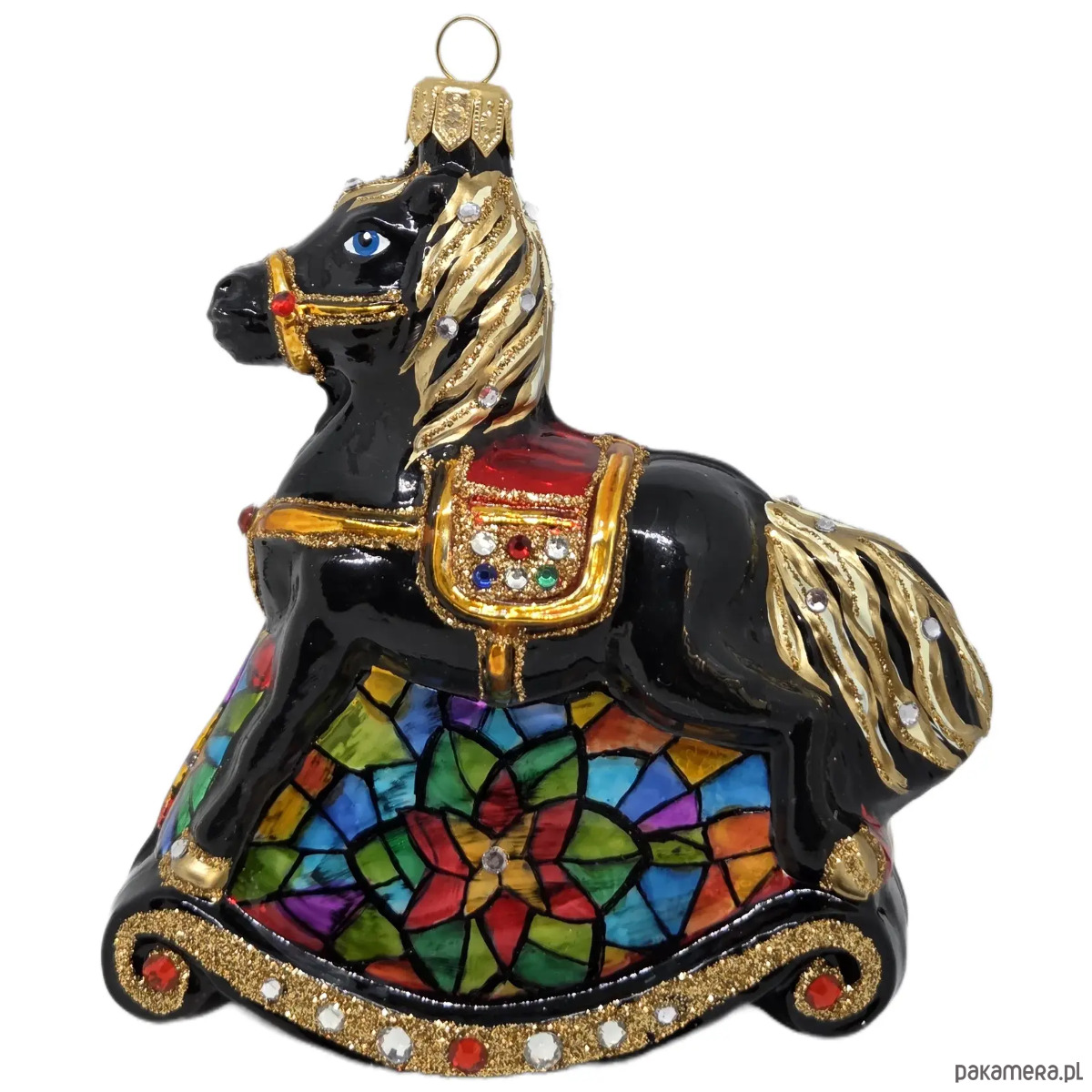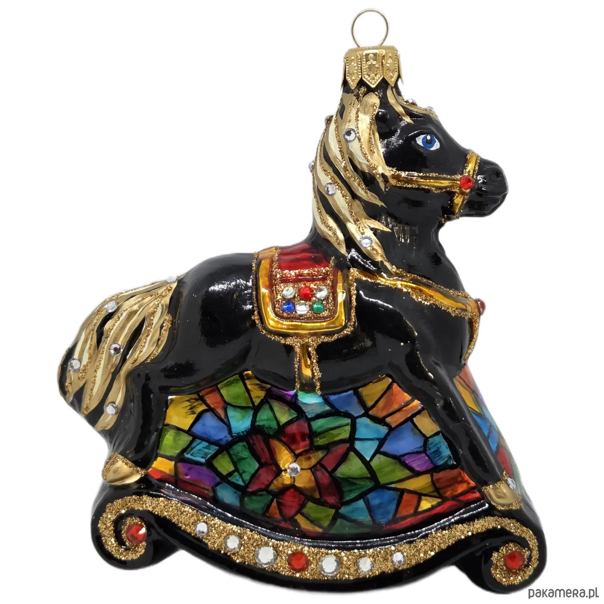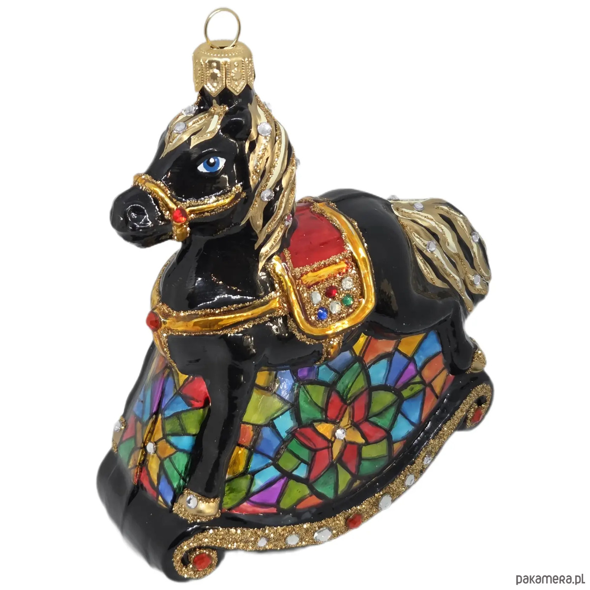 Ręcznie malowana bombka szklana czarny konik na biegunach z wzorem witrażu