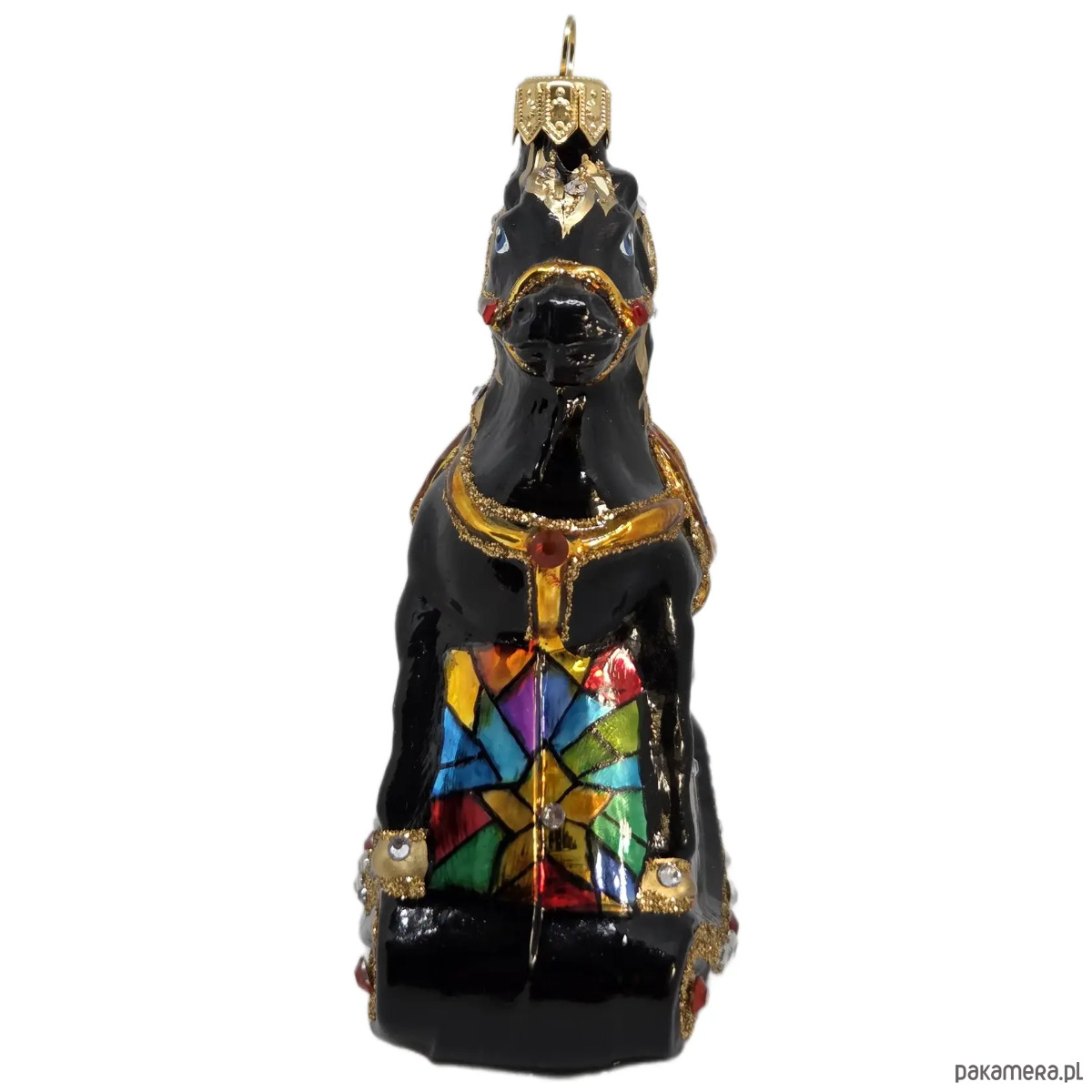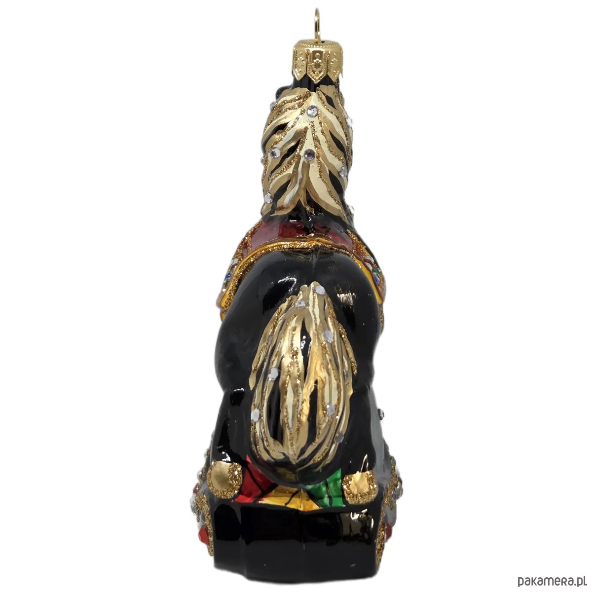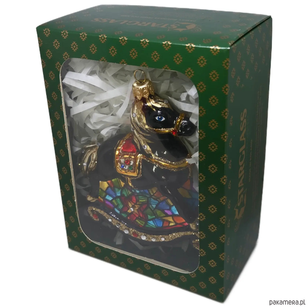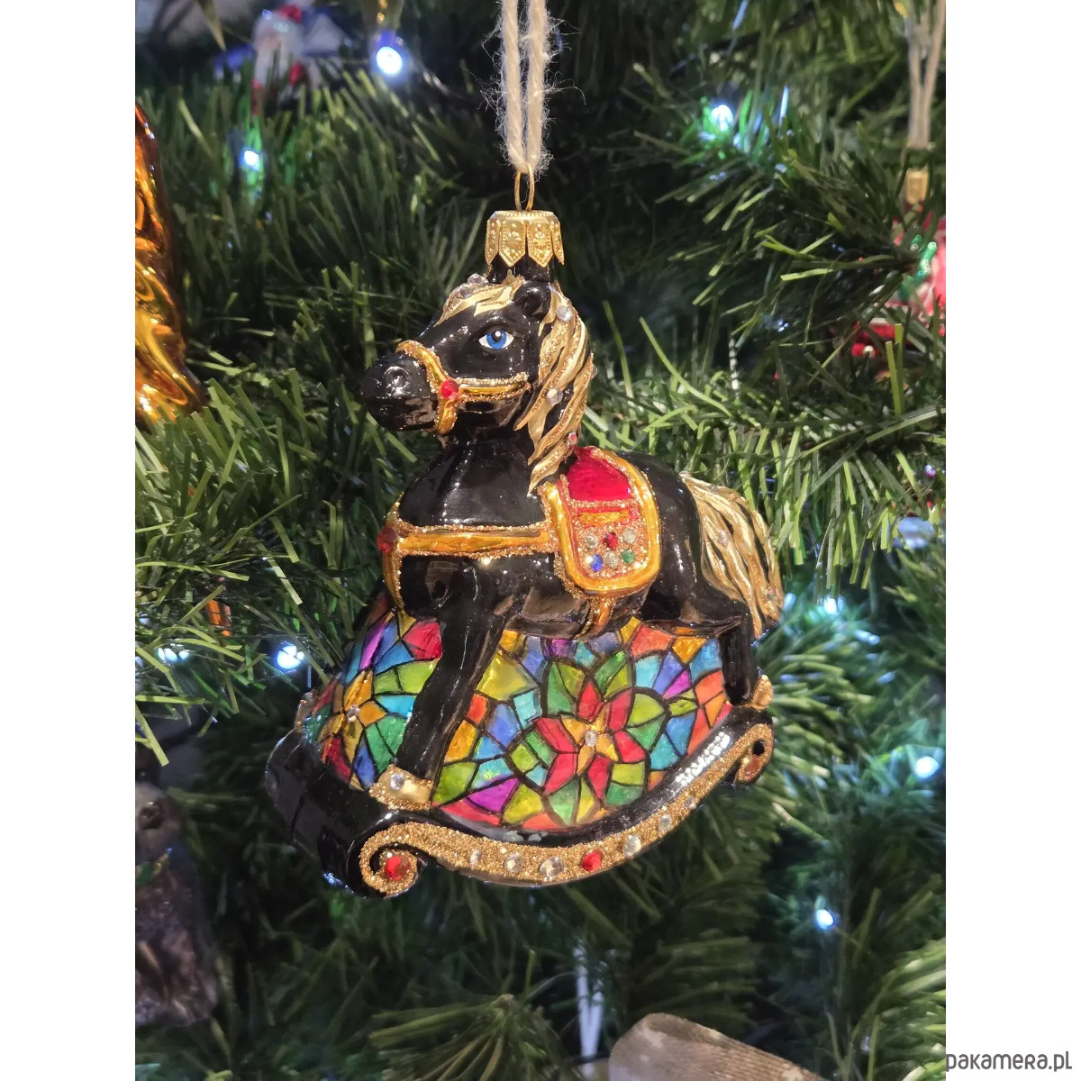 Ręcznie malowana bombka szklana czarny konik na biegunach z wzorem witrażu