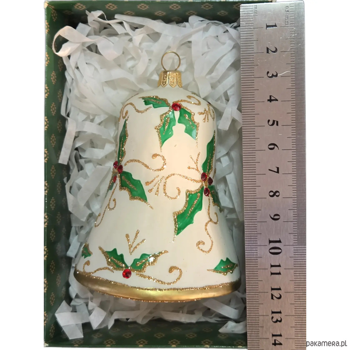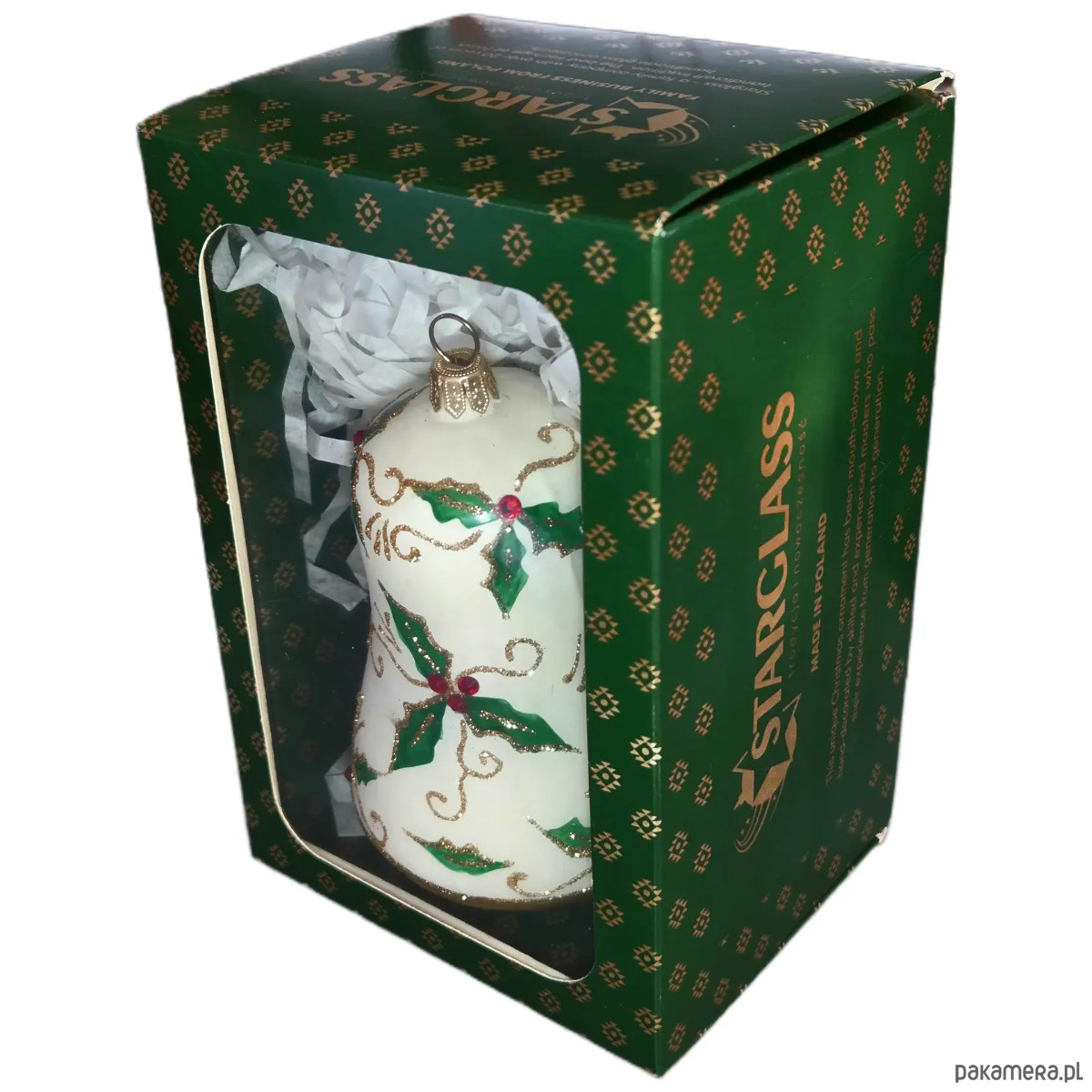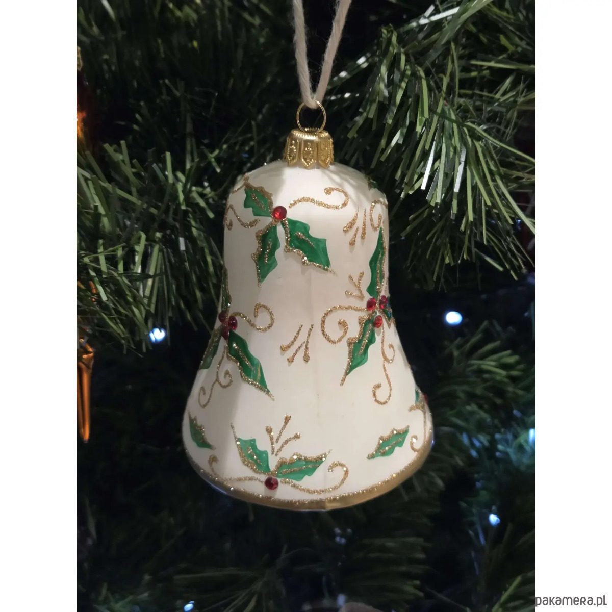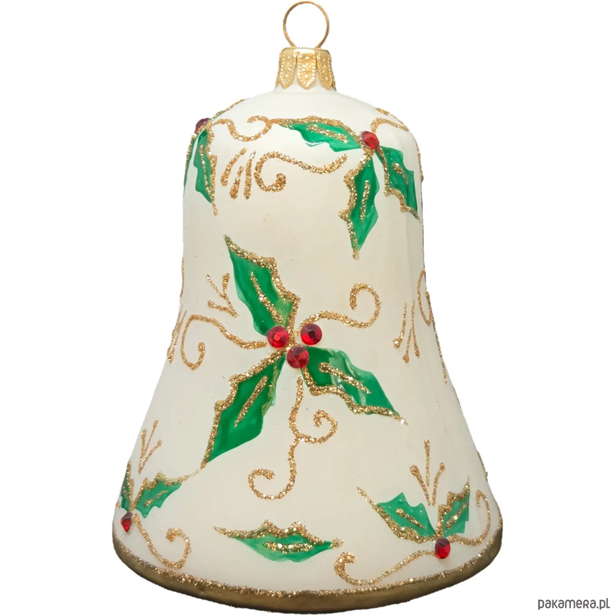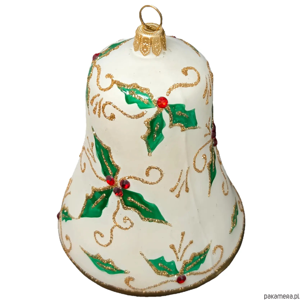 Ręcznie malowana bombka szklana biały dzwon z ostrokrzewem