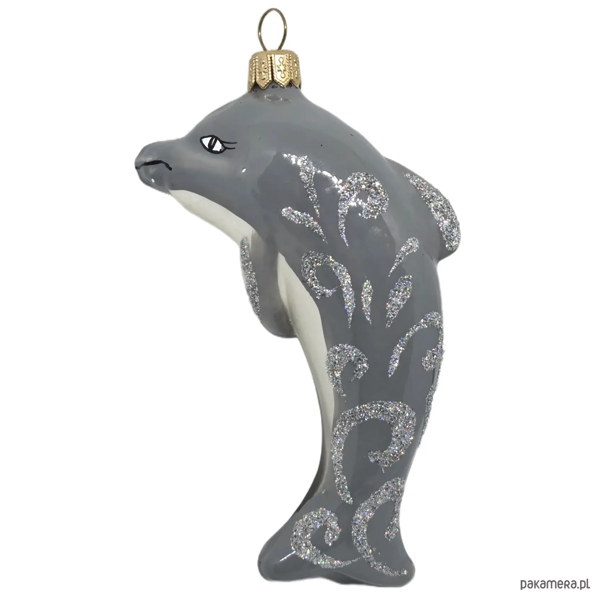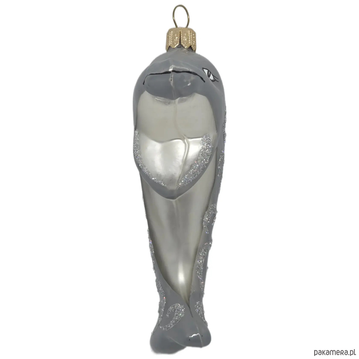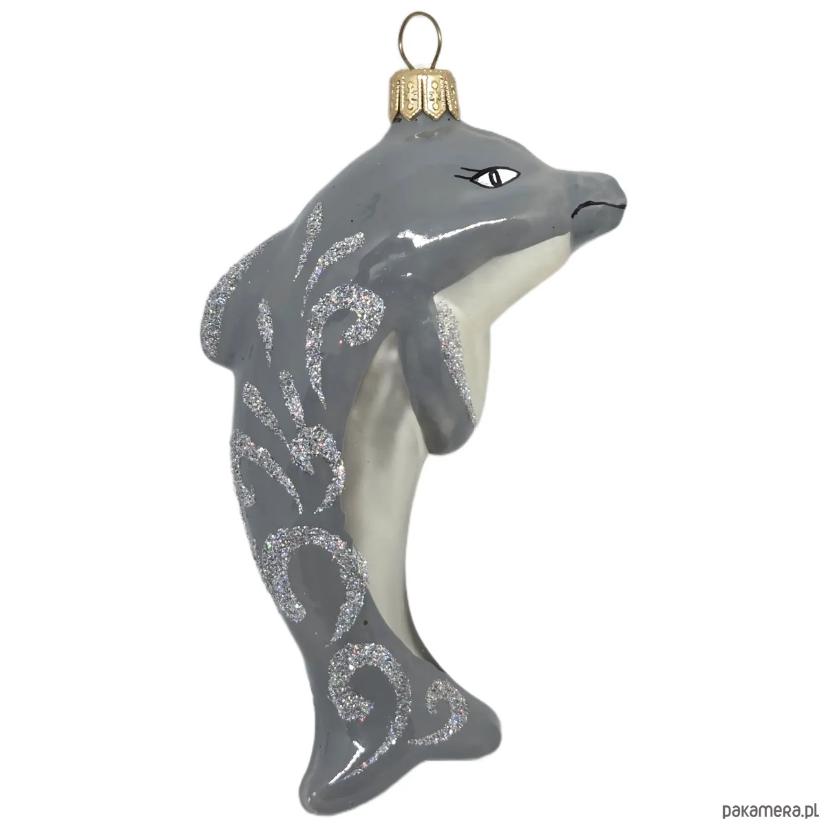 Ręcznie malowana bombka szklana szary delfin zdobiony brokatem