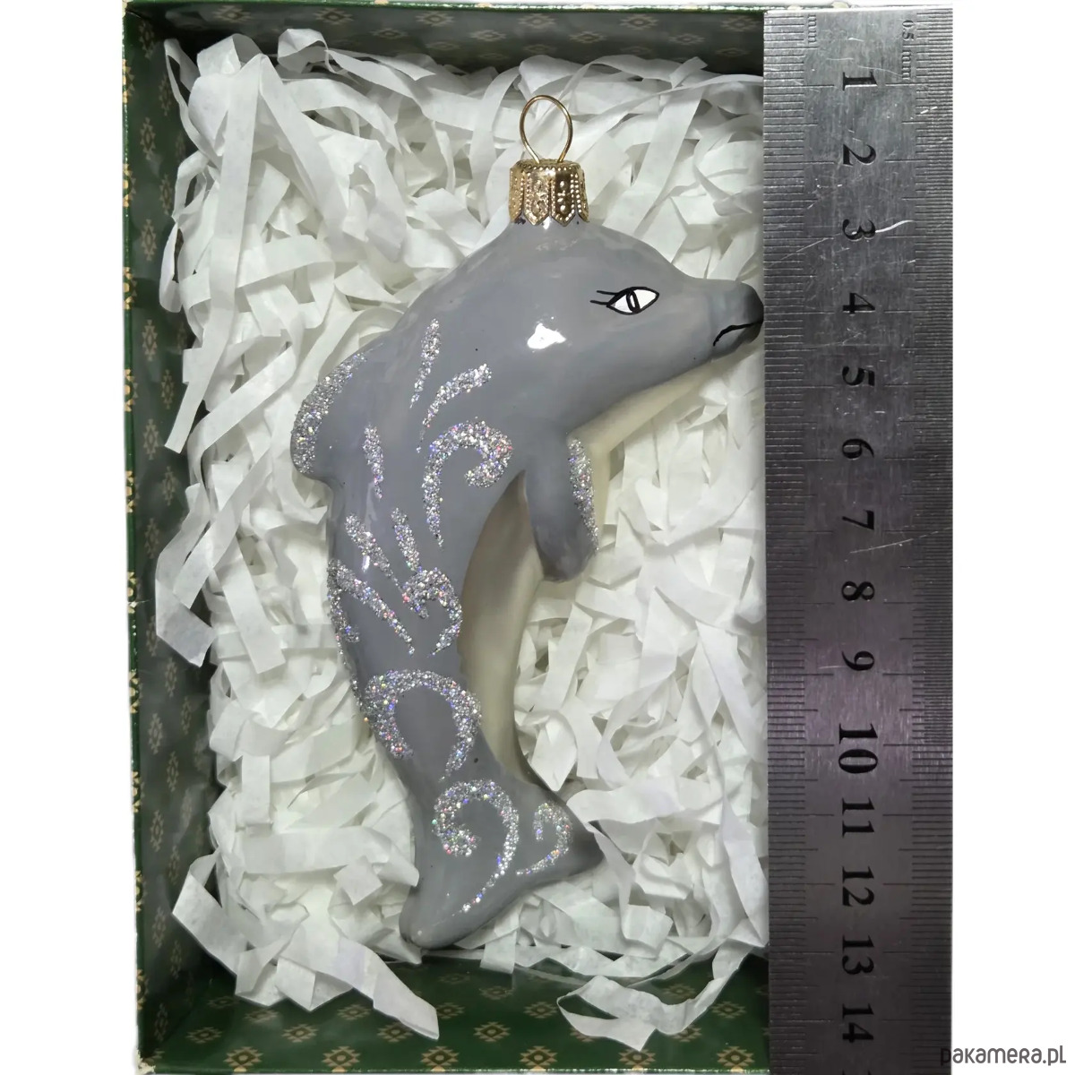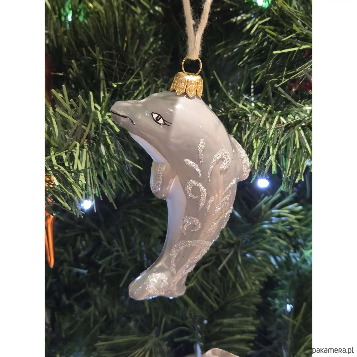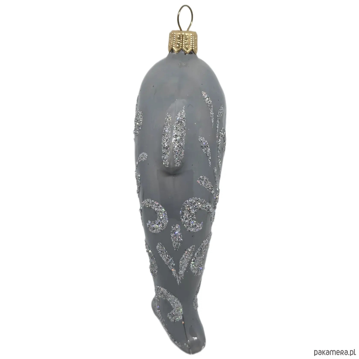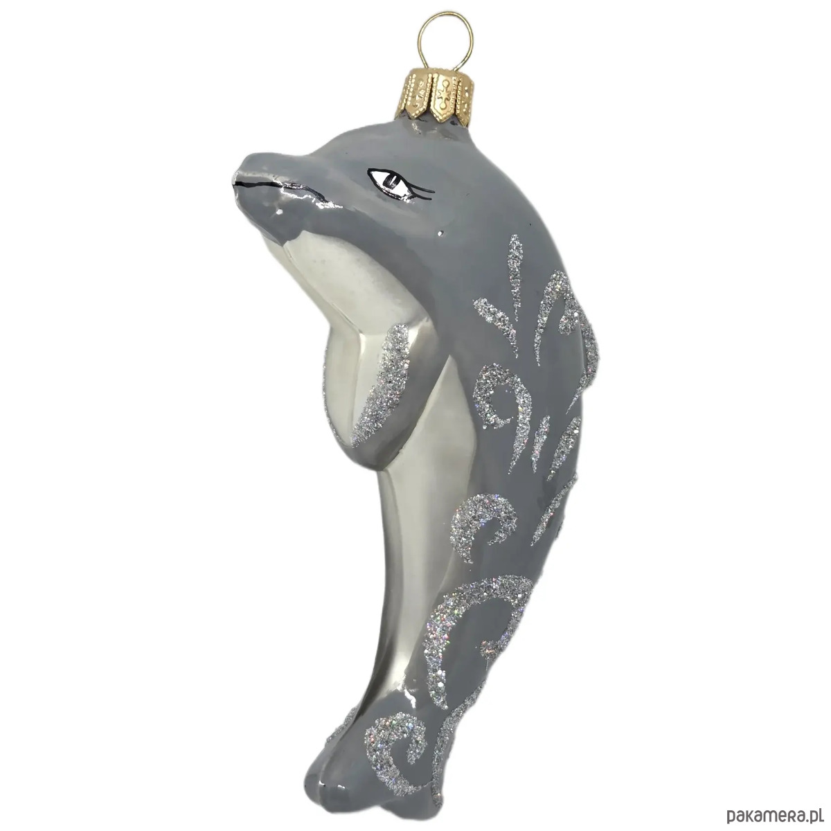Ręcznie malowana bombka szklana szary delfin zdobiony brokatem