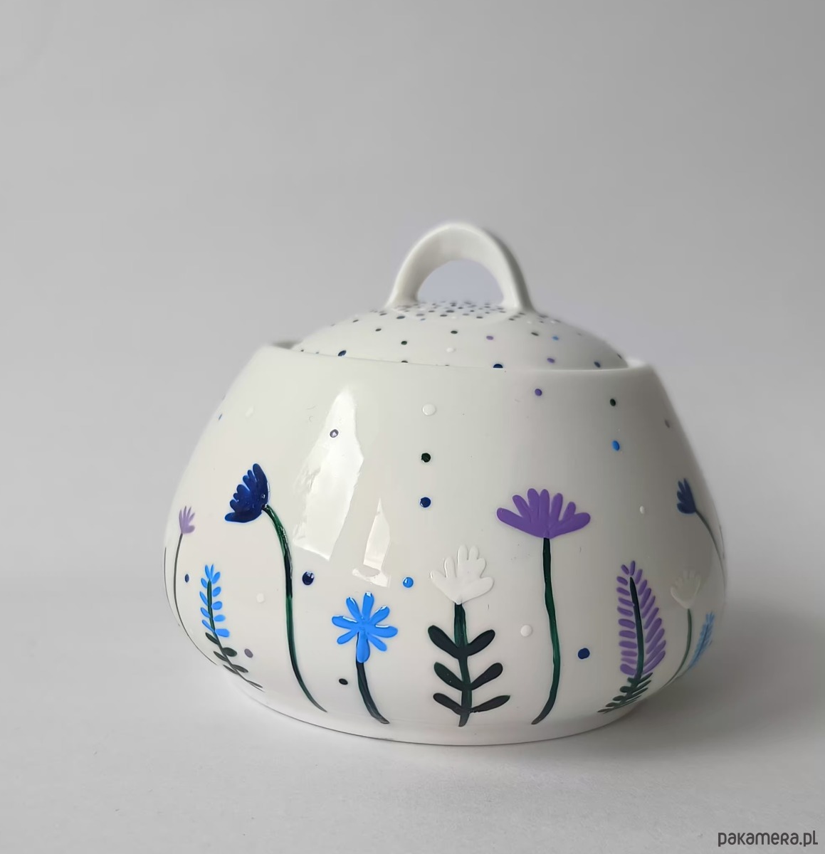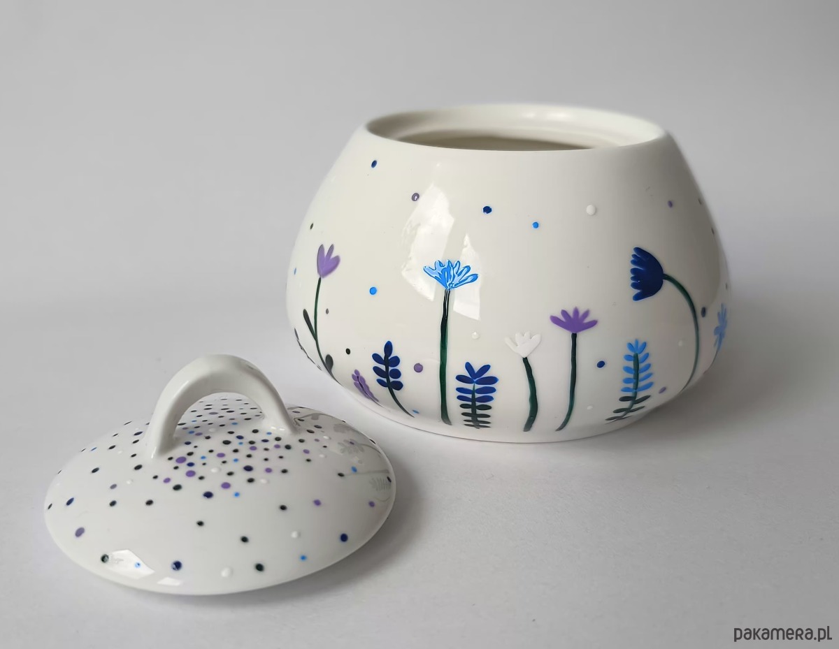 Urocza porcelanowa cukiernica z ręcznie malowanymi kwiatami.