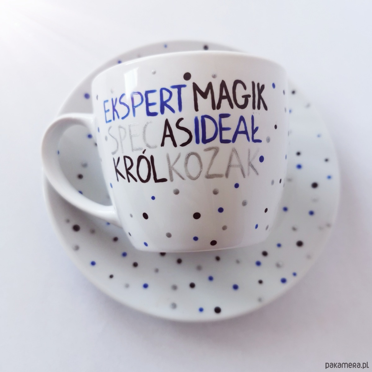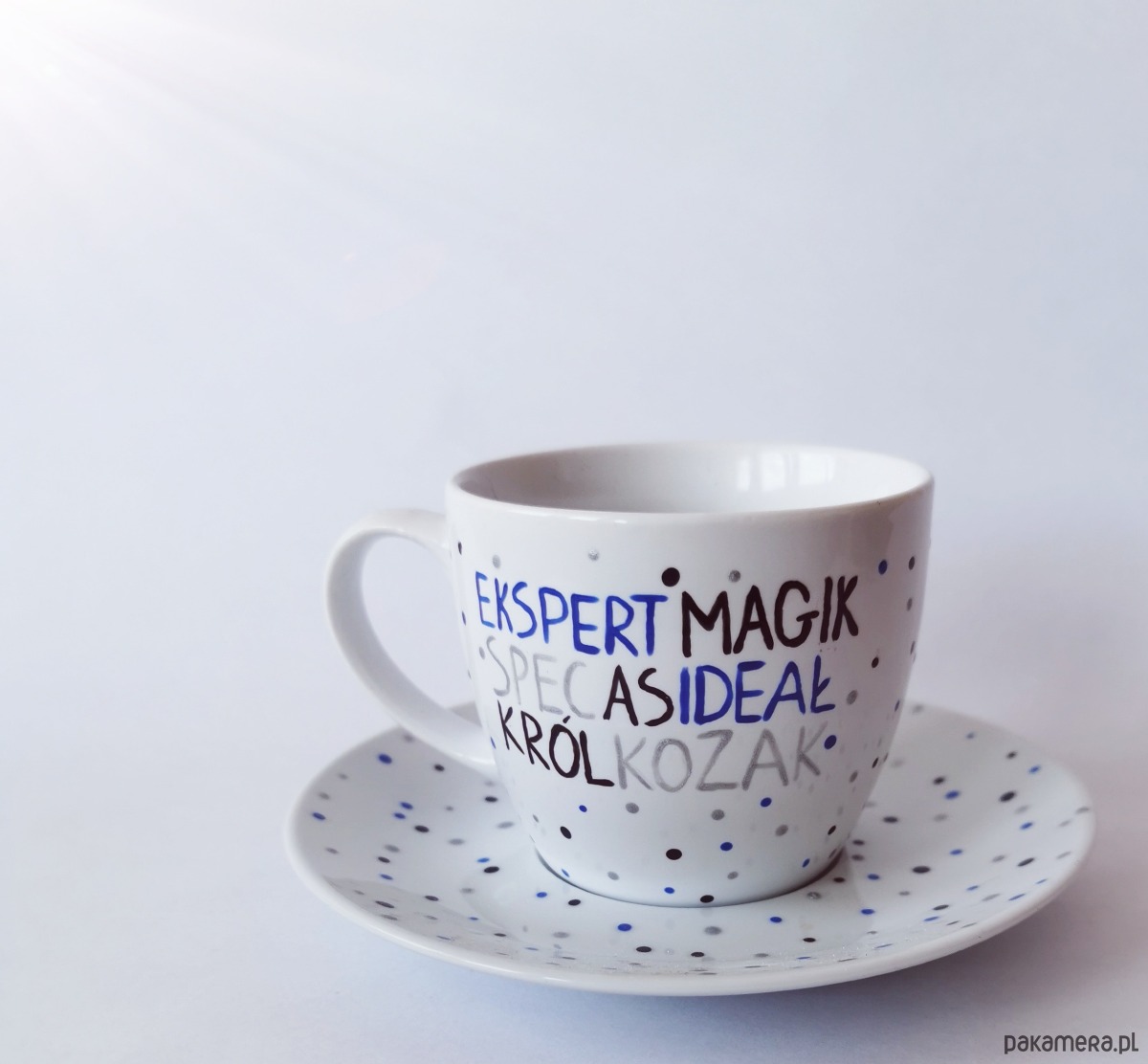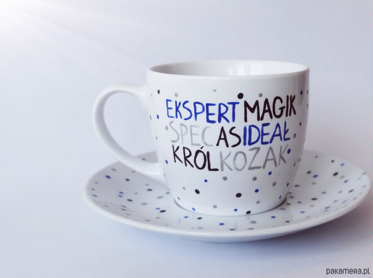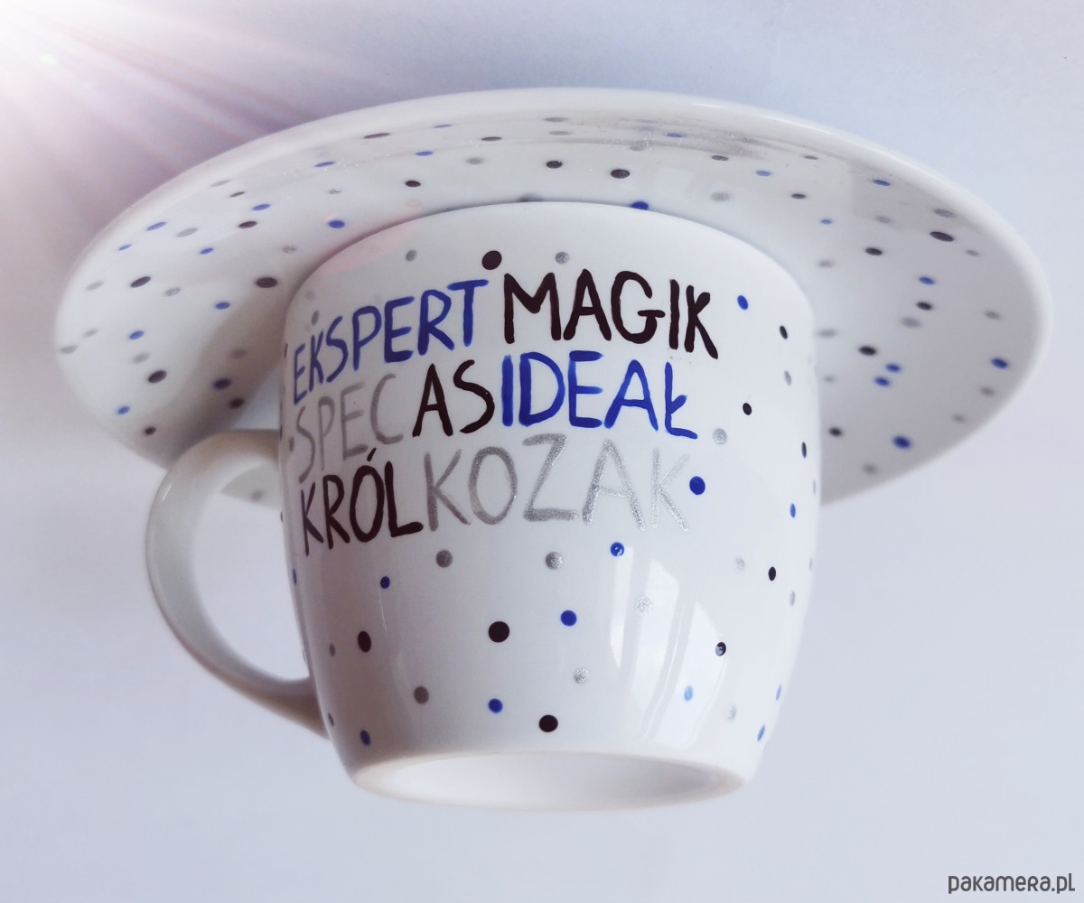 Urocza filiżanka w groszki z napisami.