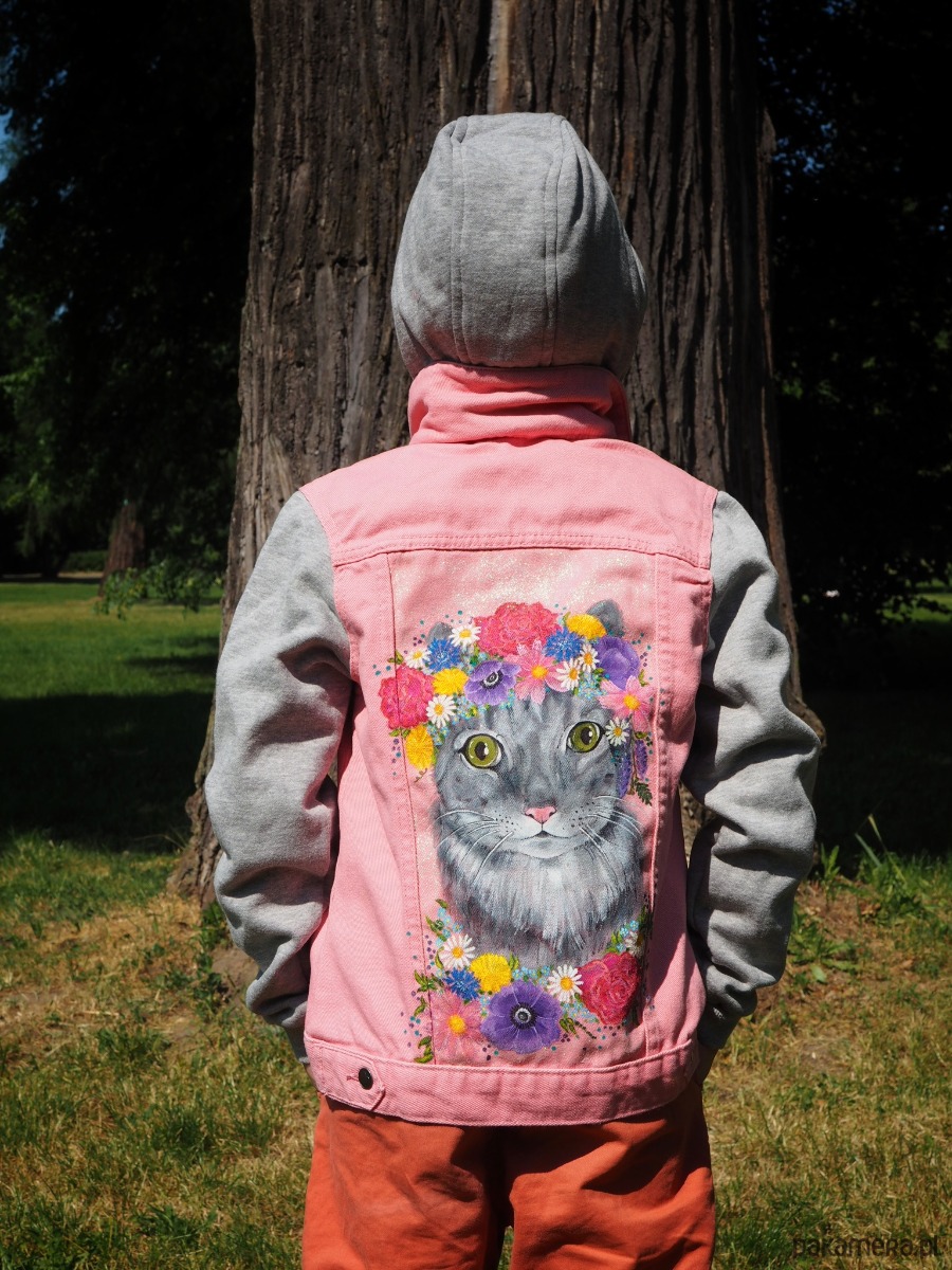 Wzór wykonany zostanie przy użyciu profesjonalnych farb do tkanin, nietoksycznych, trwałych i wodoodpornych. Kurtkę można prać w pralce. Szczegółowa instrukcja prania będzie dołączona do gotowego produktu.