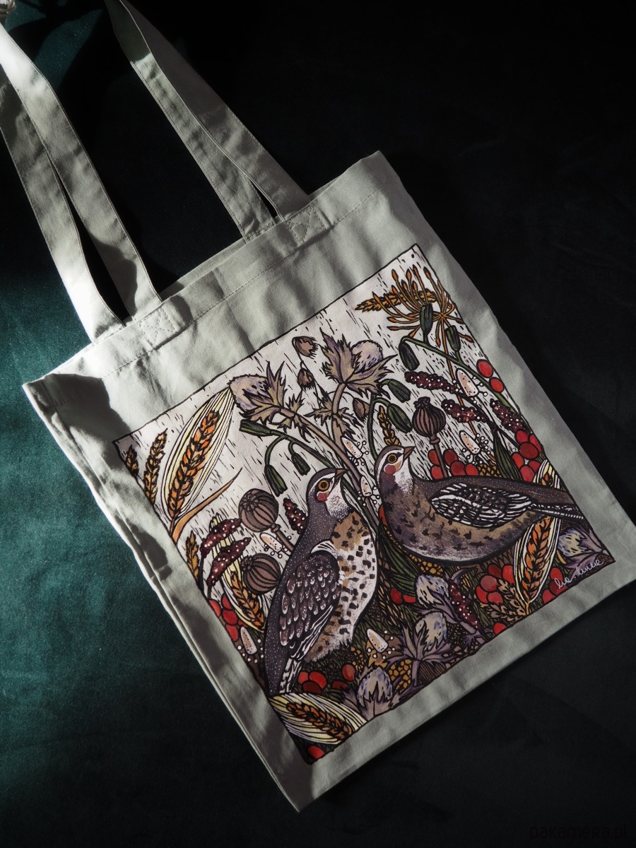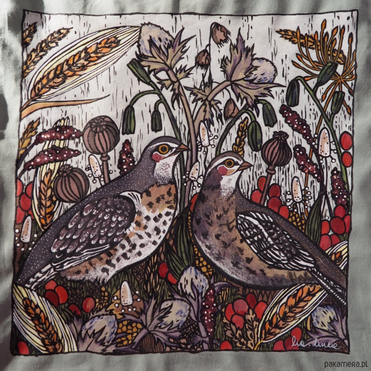 Ręcznie malowana bawełniana torba zakupowa z wzorem kuropatw na polu. Będzie doskonałym uzupełnieniem stroju lub prezentem imieninowym, urodzinowym, gwiazdkowym itp. dla osoby ceniącej rękodzieło. Torba będzie idealna do pracy, na spacer po mieście, do szkoły - zmieści teczkę z dokumentami, drugie śniadanie, wodę, telefon, portfel itd. Ciekawy wzór przyciągnie spojrzenia wokół. Sprawdzi się zarówno na co dzień, jak i na wakacyjny wyjazd. Wzór na torbie jest trwały i wodoodporny - torbę można wyprać ręcznie w temp. do 30 stopni (nie wykręcać, nie wirować - powiesić z wodą do odcieknięcia. Można prasować po lewej stronie).