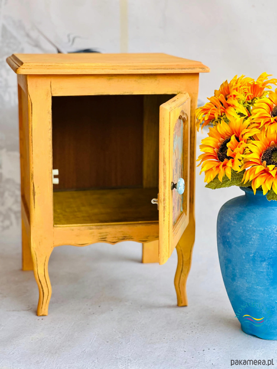 Szafka przy użyciu farb kredowych w odcieniach pomarańczu i żółci, które nadają jej słoneczny, energetyczny charakter. Delikatne przetarcia podkreślają styl vintage i artystyczną duszę mebla.