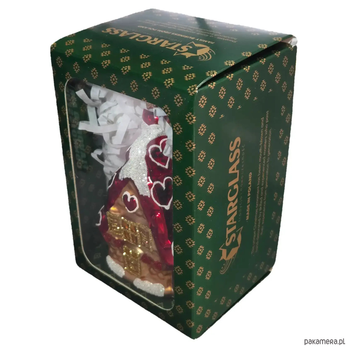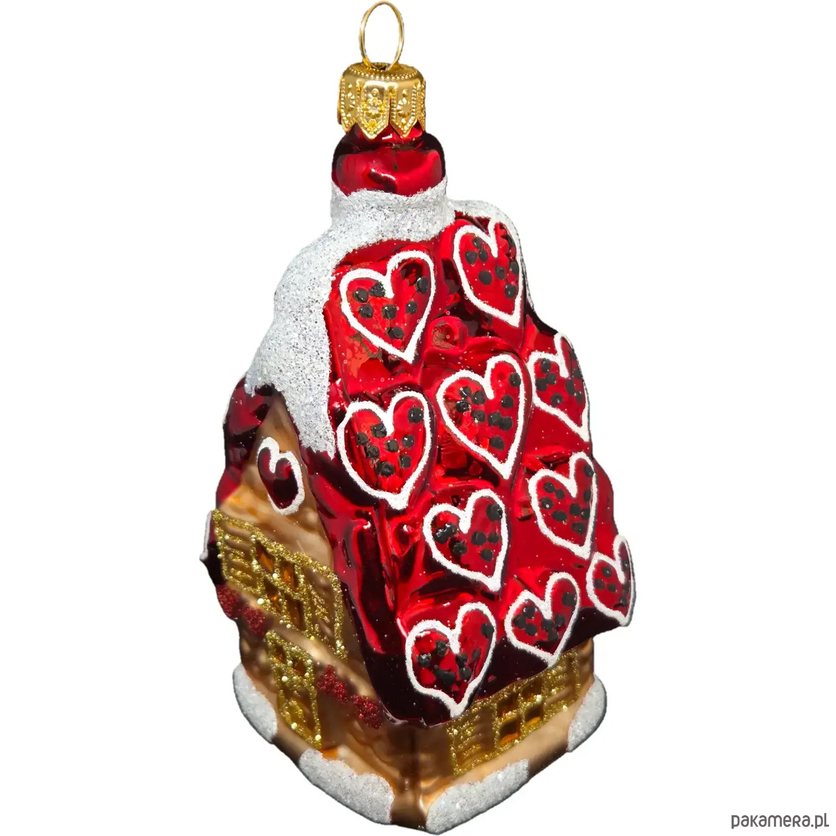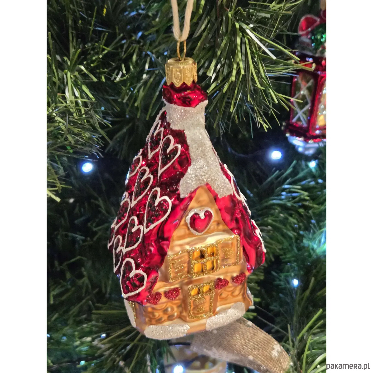 Ręcznie Malowana Szklana Bombka Domek Miłości z Czerwonym Dachem i Sercami