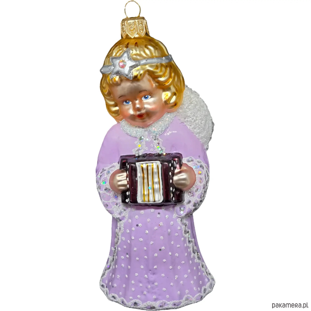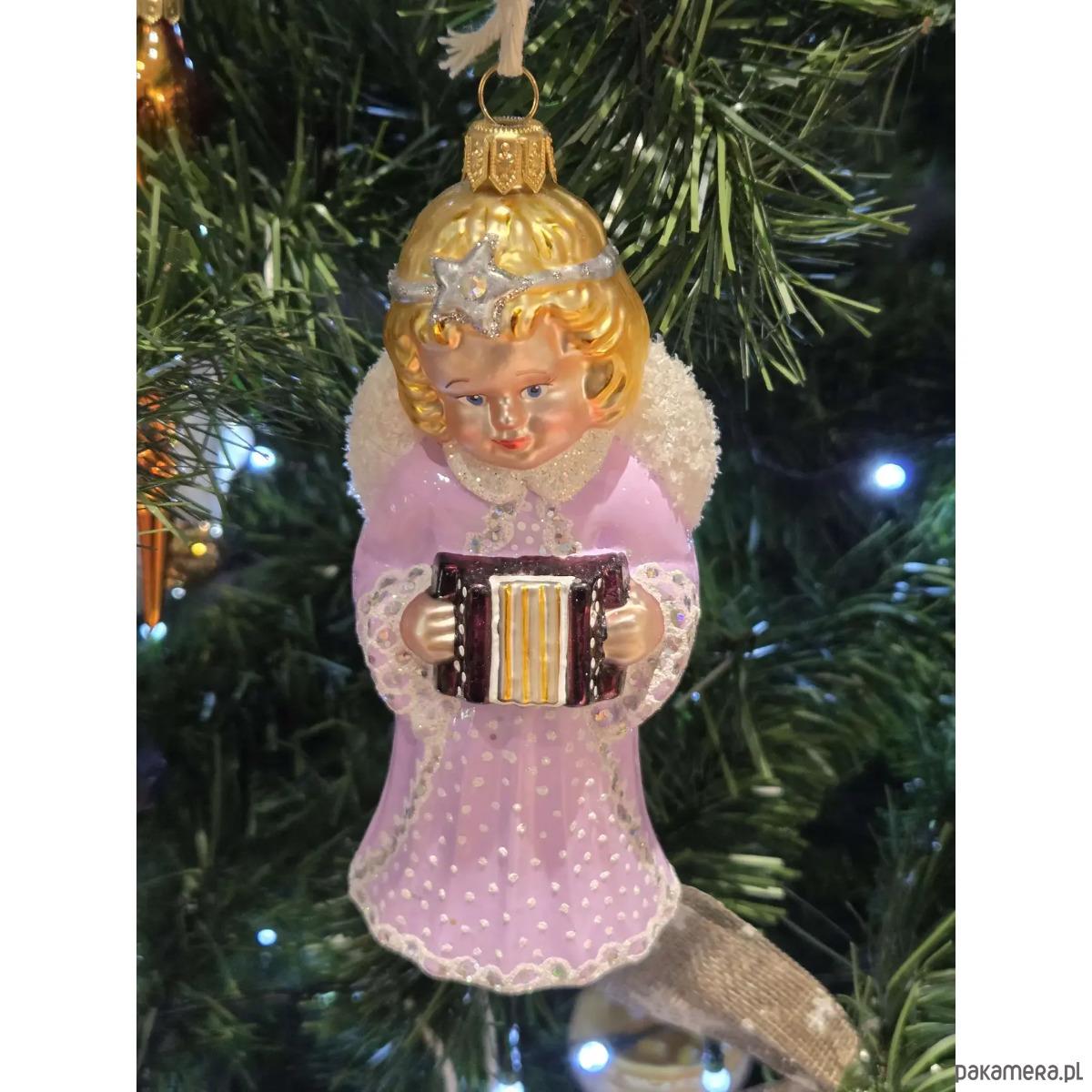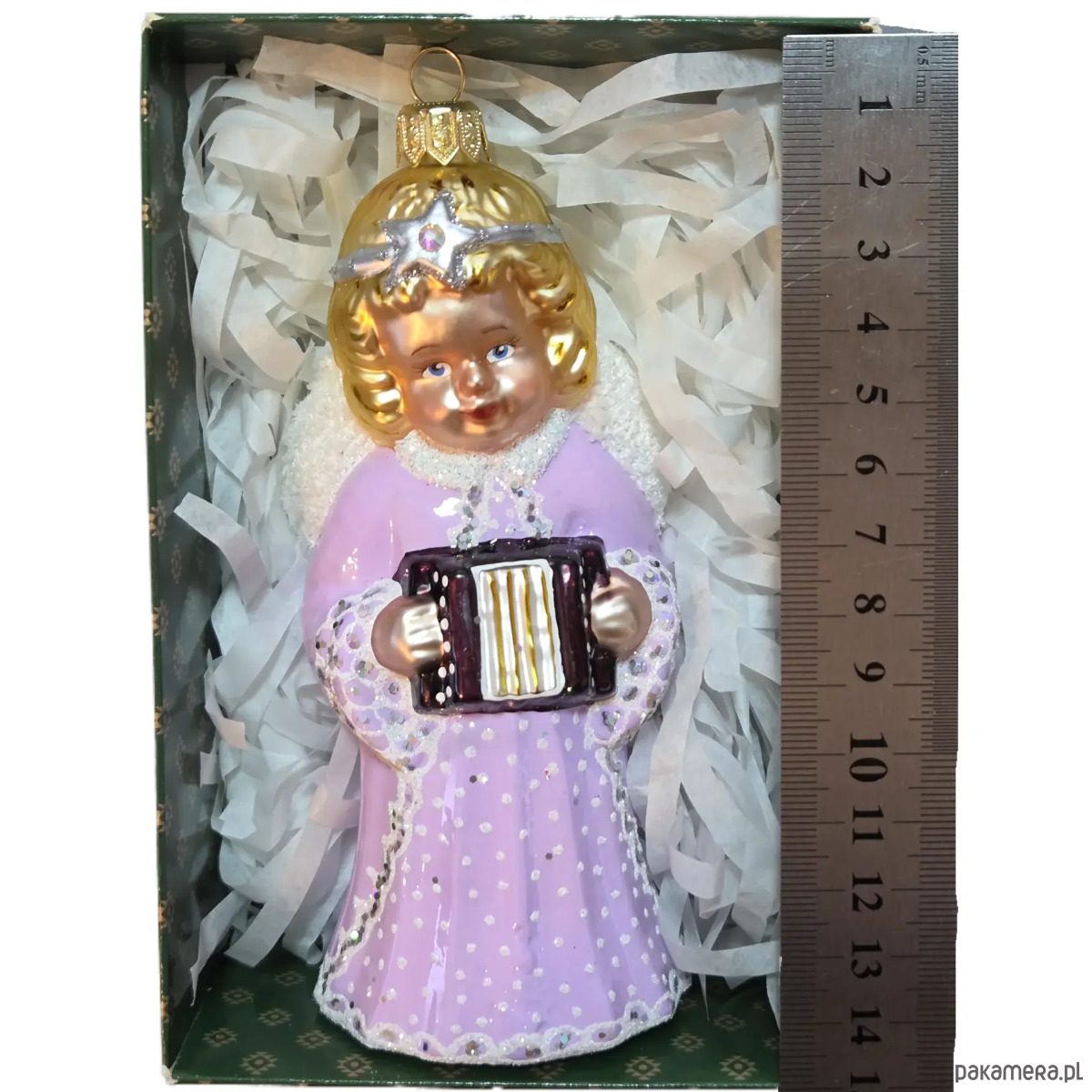 Ręcznie malowana szklana bombka aniołek w różowej sukni z akordeonem