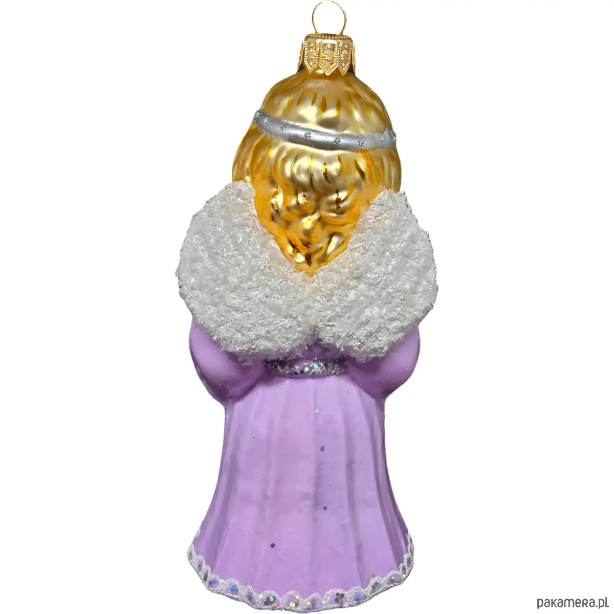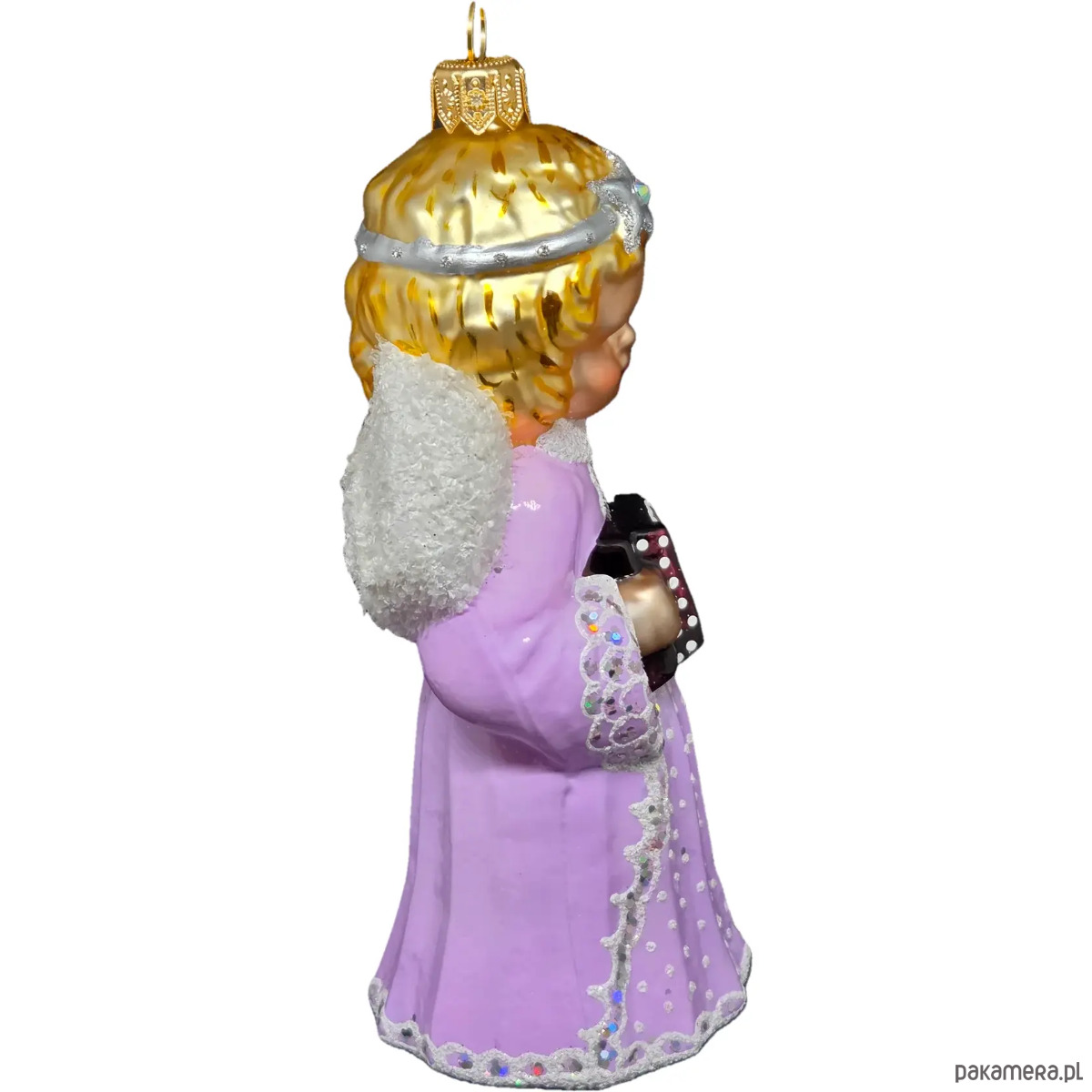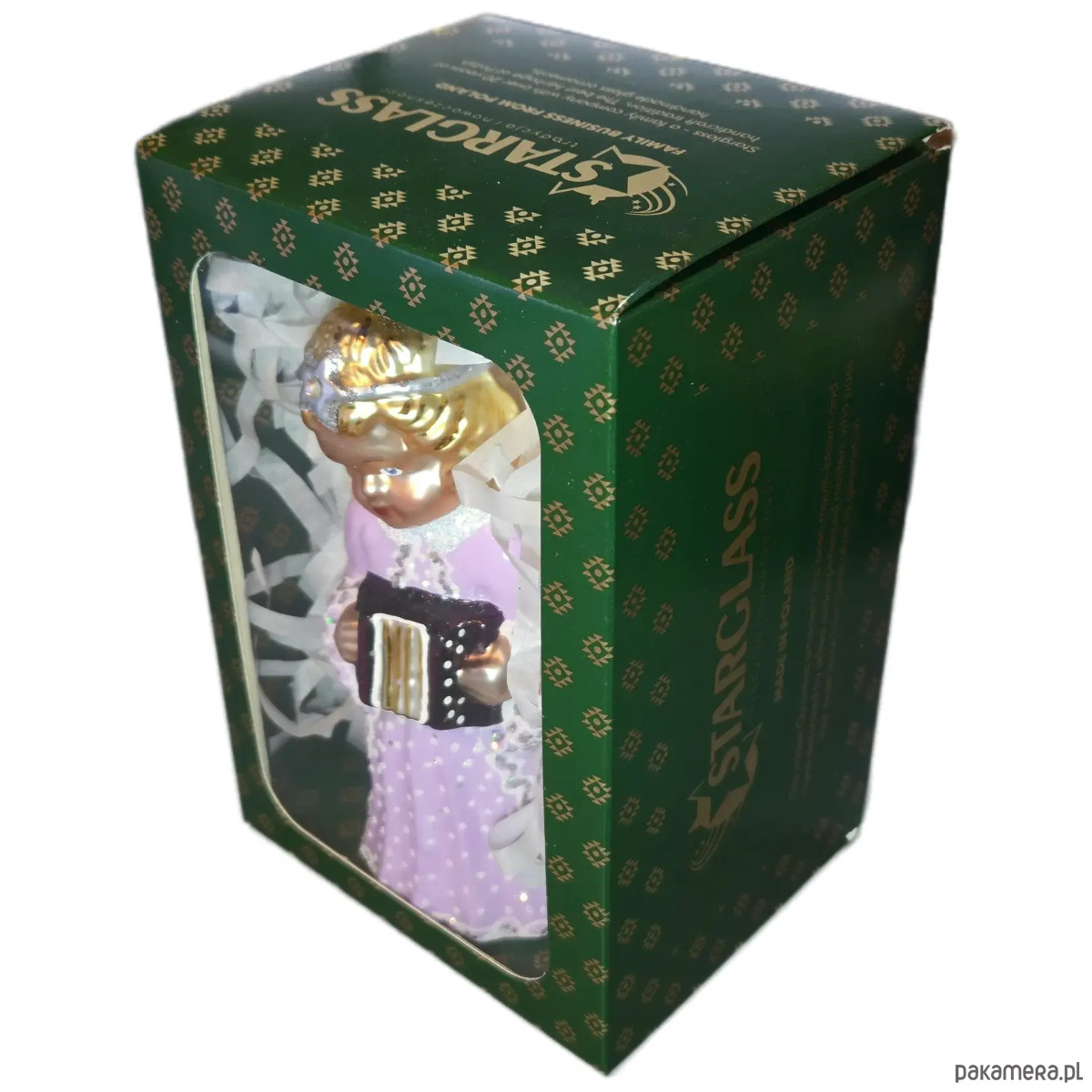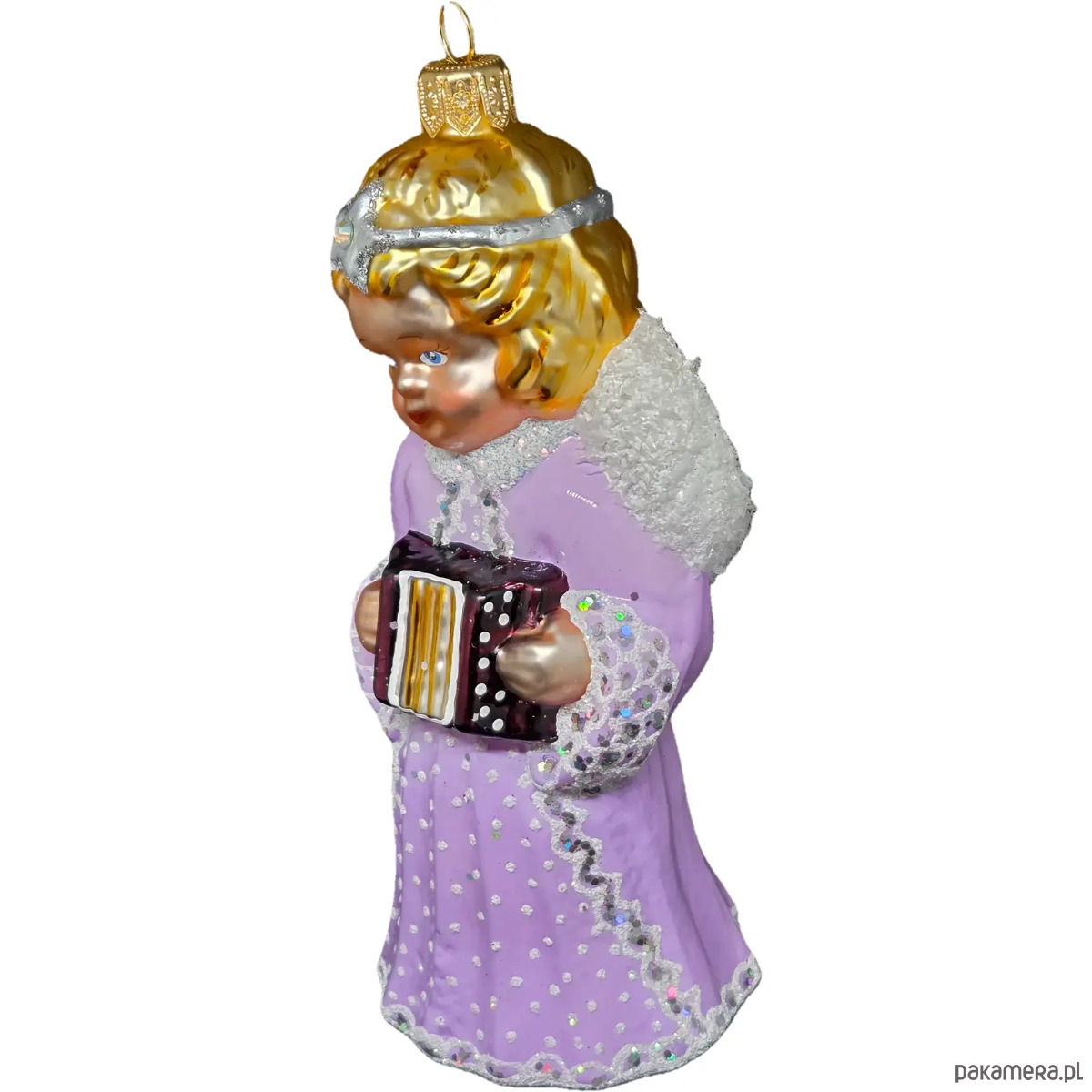 Ręcznie malowana szklana bombka aniołek w różowej sukni z akordeonem