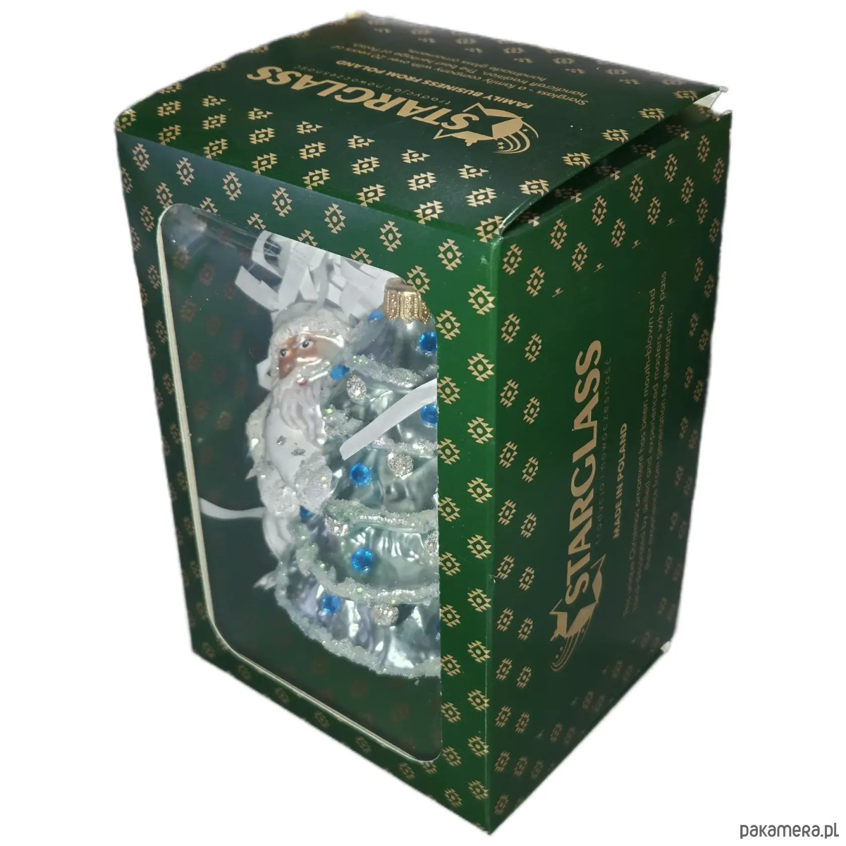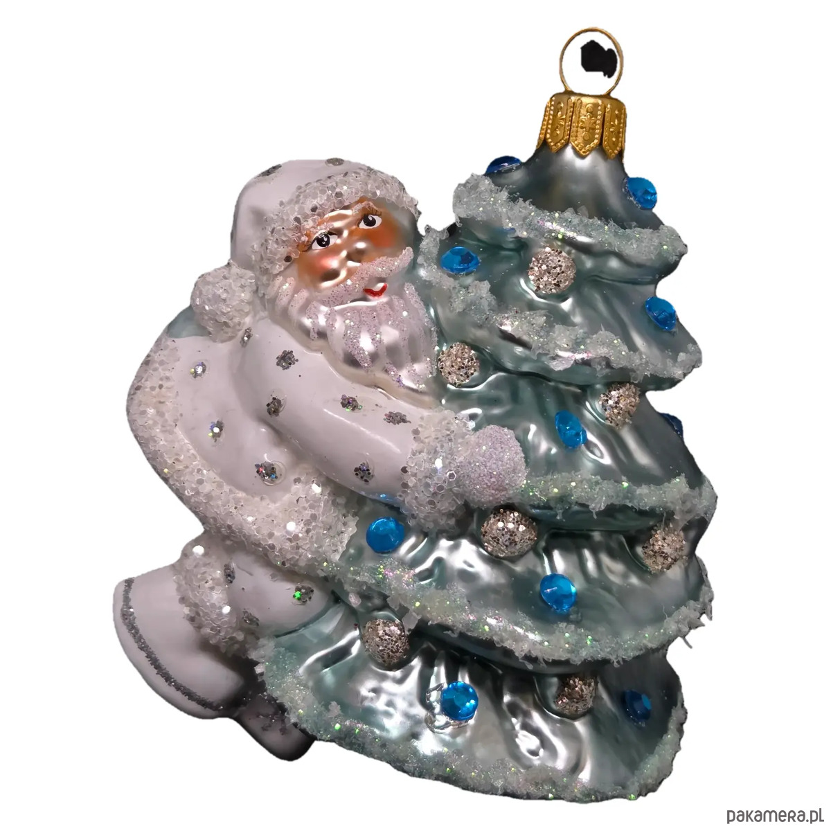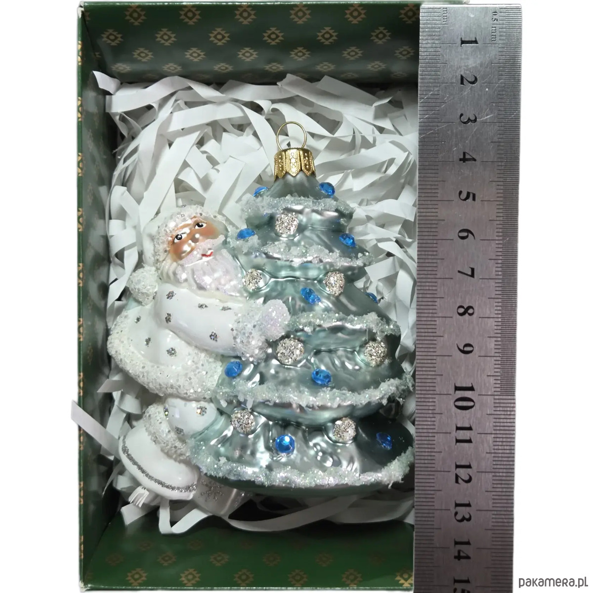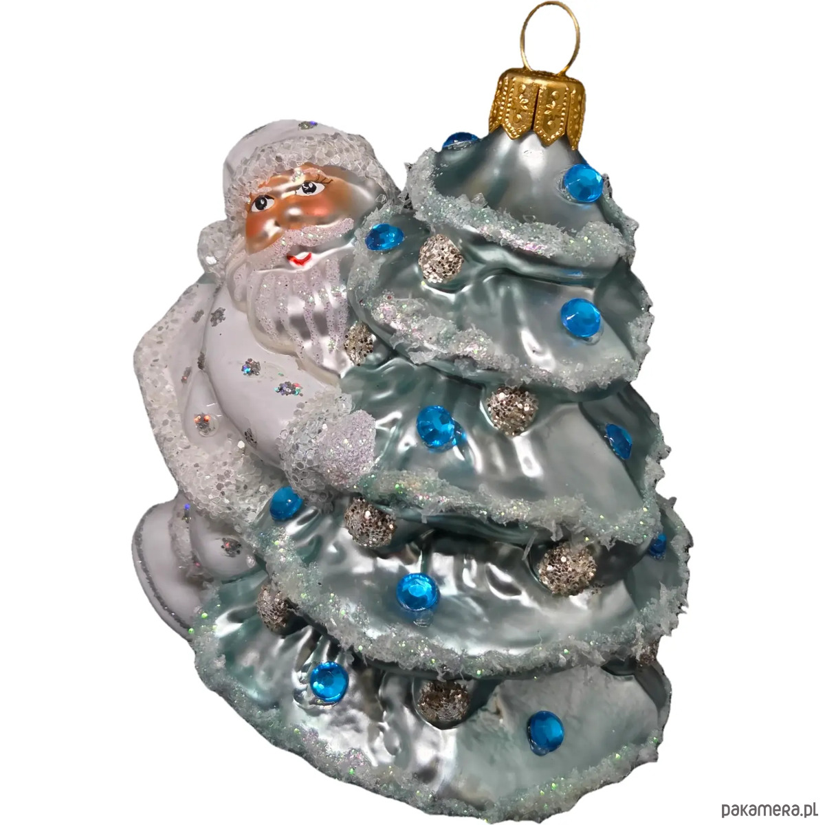 Ręcznie malowana szklana bombka biały Mikołaj na niebieskiej choince