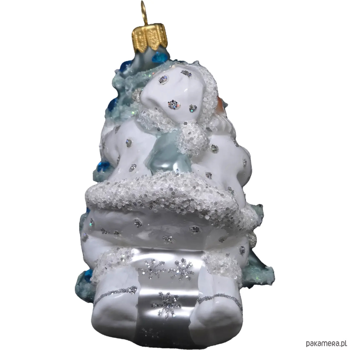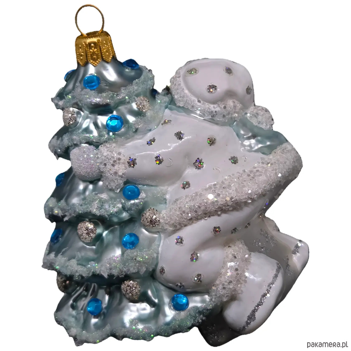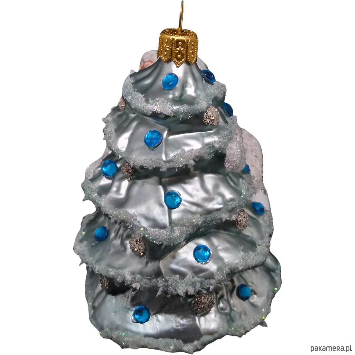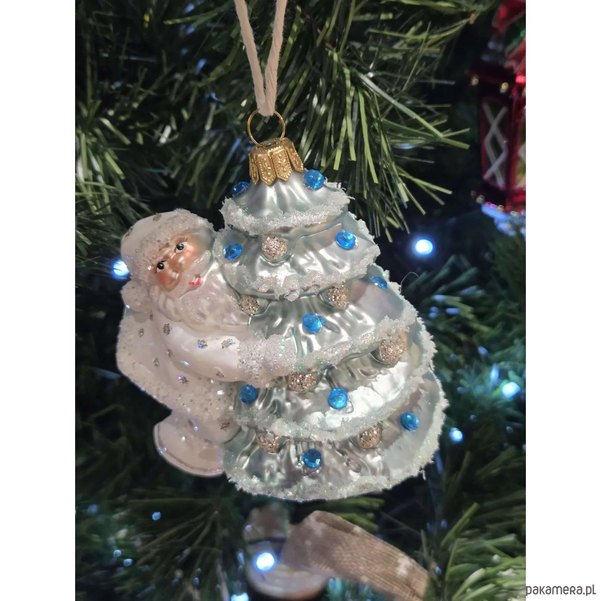 Ręcznie malowana szklana bombka biały Mikołaj na niebieskiej choince