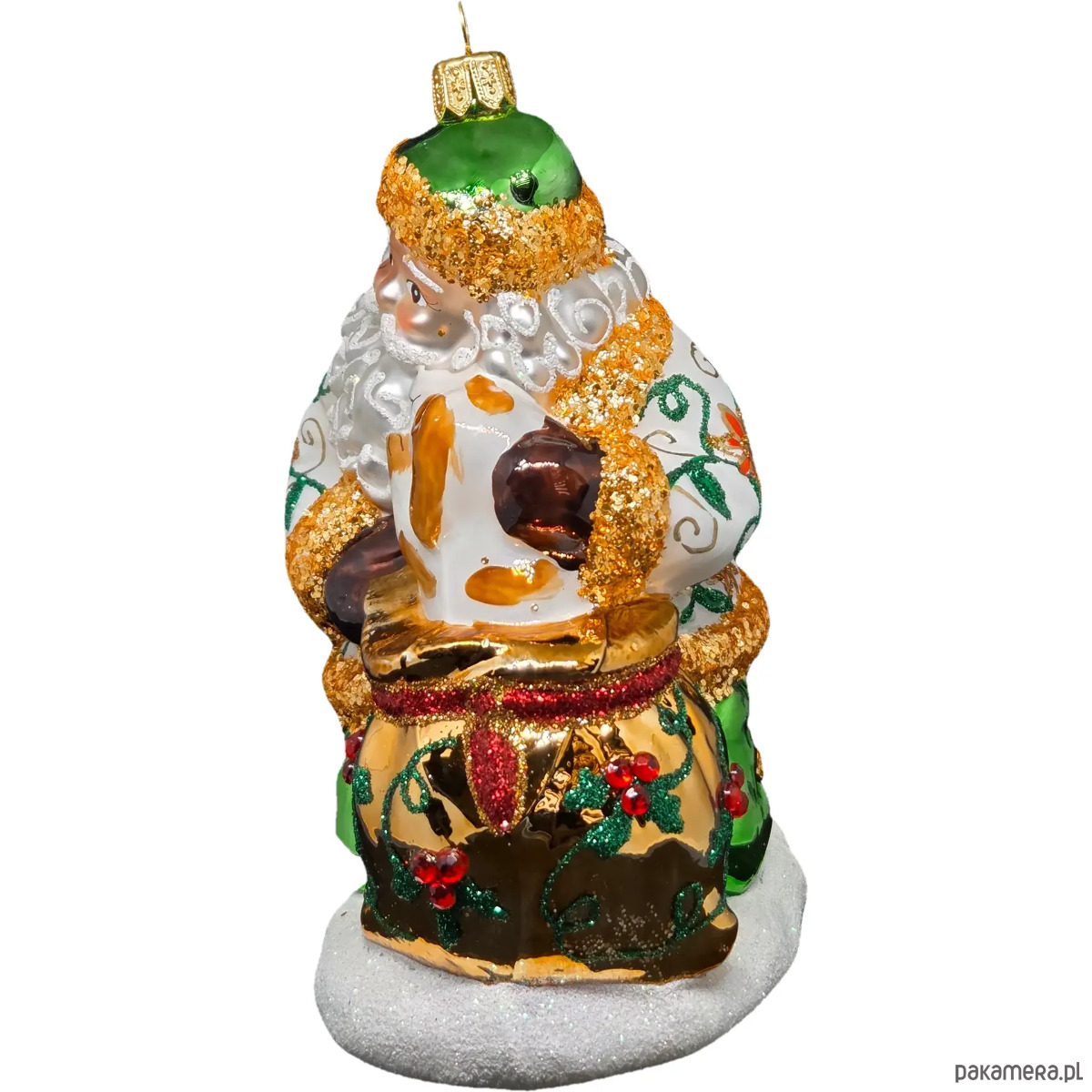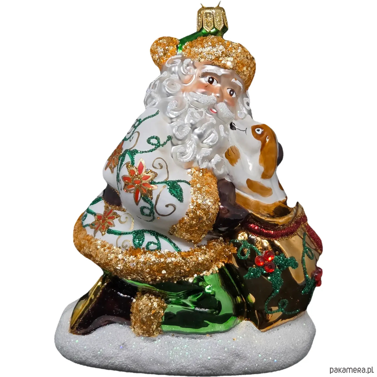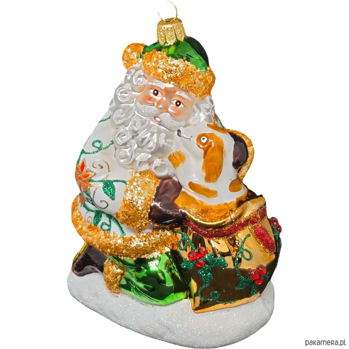 Ręcznie malowana szklana bombka wzorzysty Mikołaj z pieskiem w worku