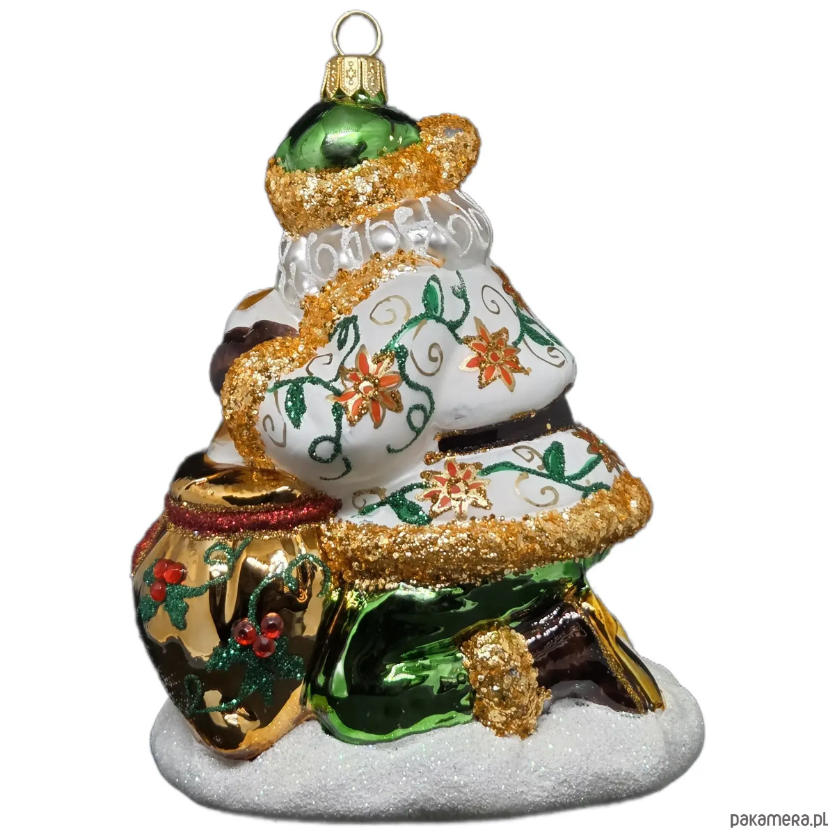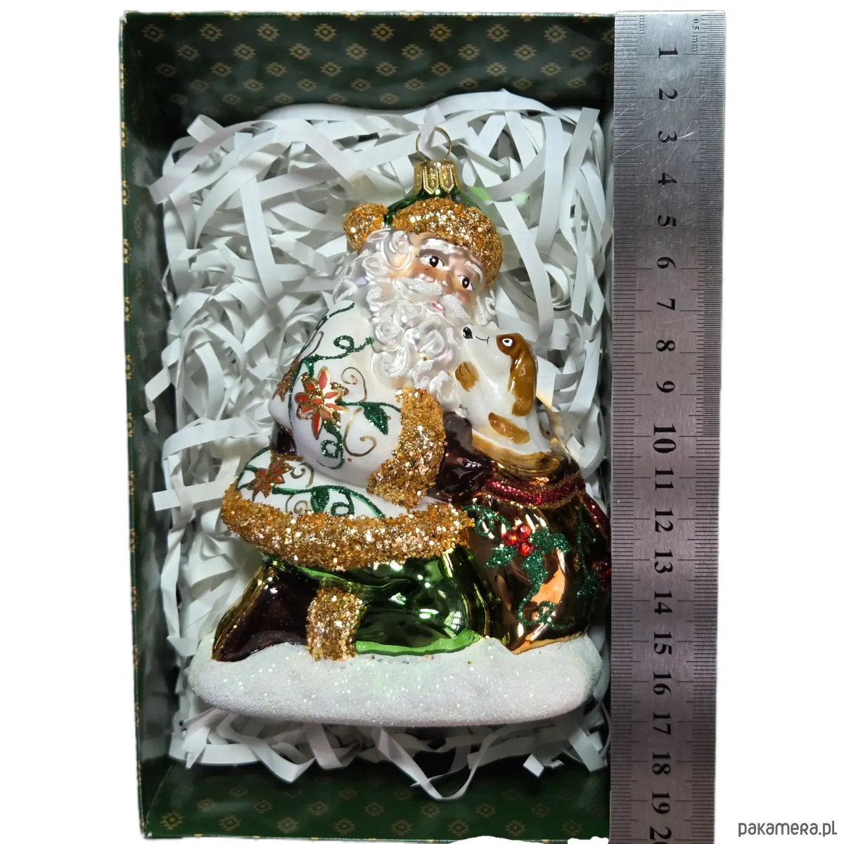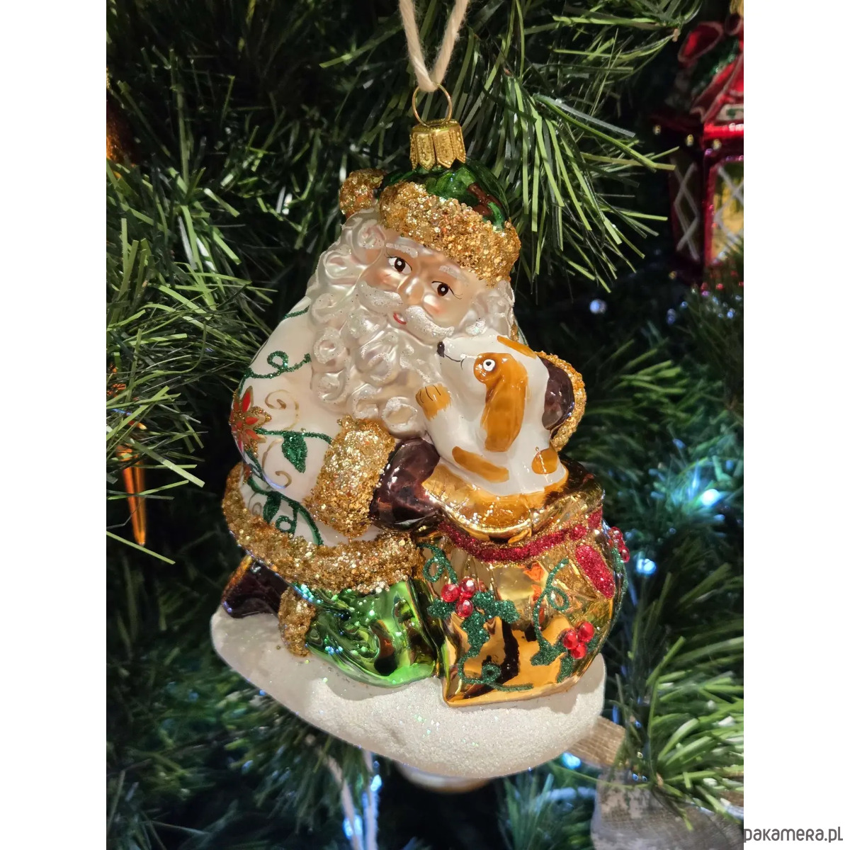 Ręcznie malowana szklana bombka wzorzysty Mikołaj z pieskiem w worku