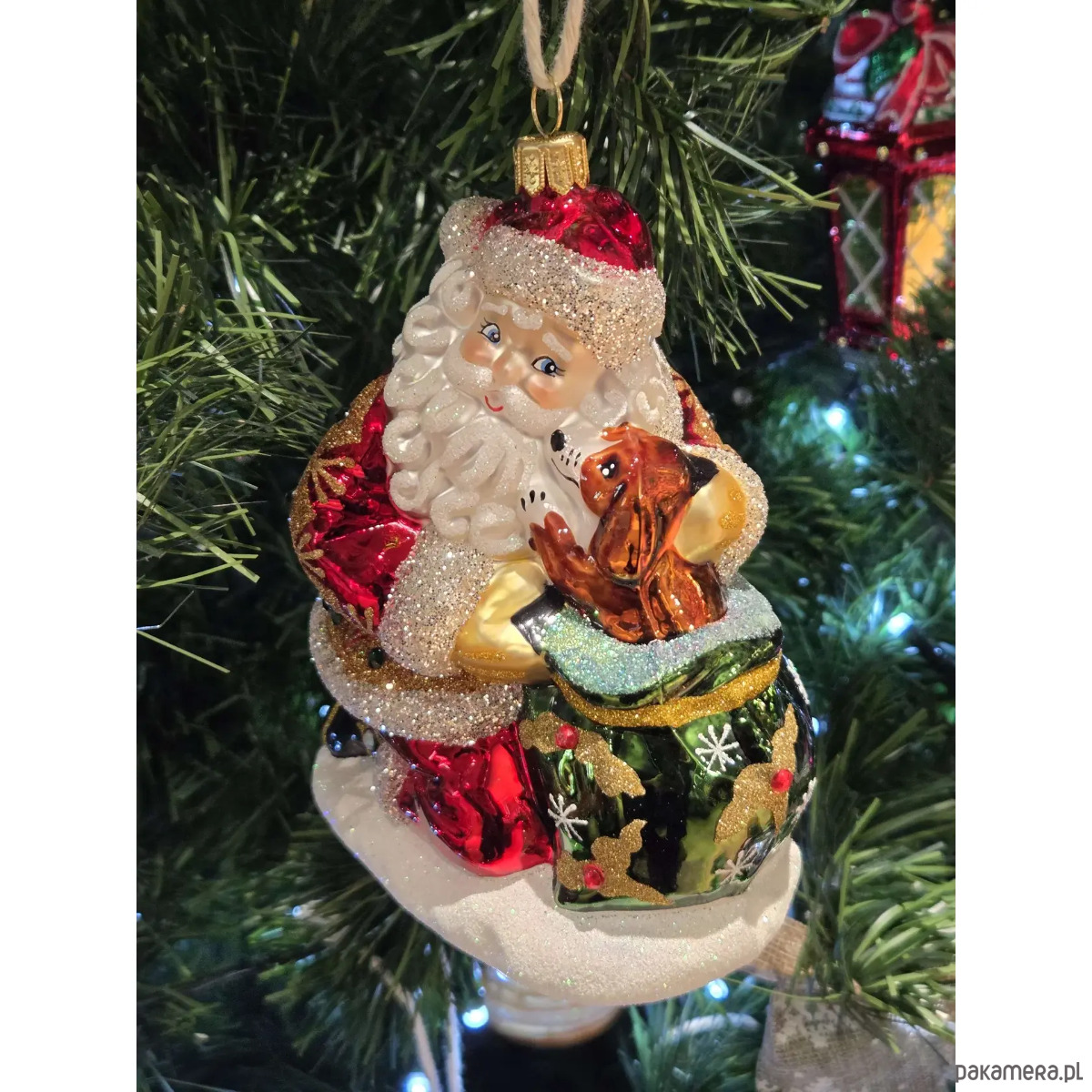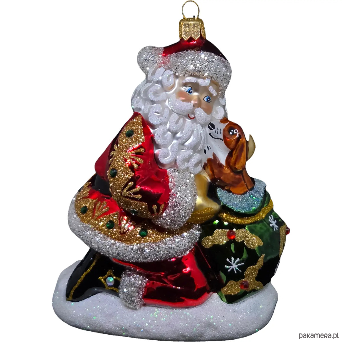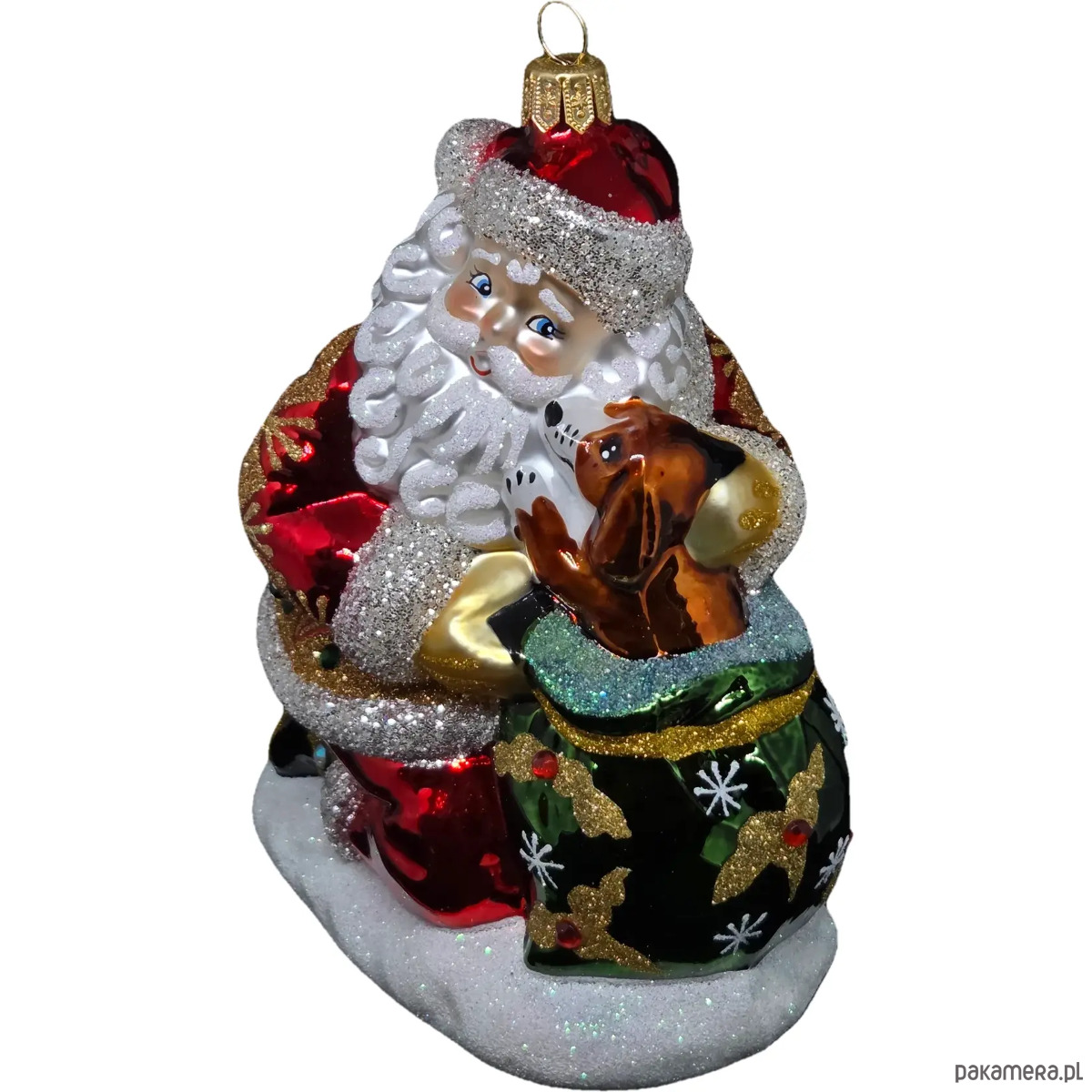 Ręcznie malowana szklana bombka Mikołaj z pieskiem w worku
