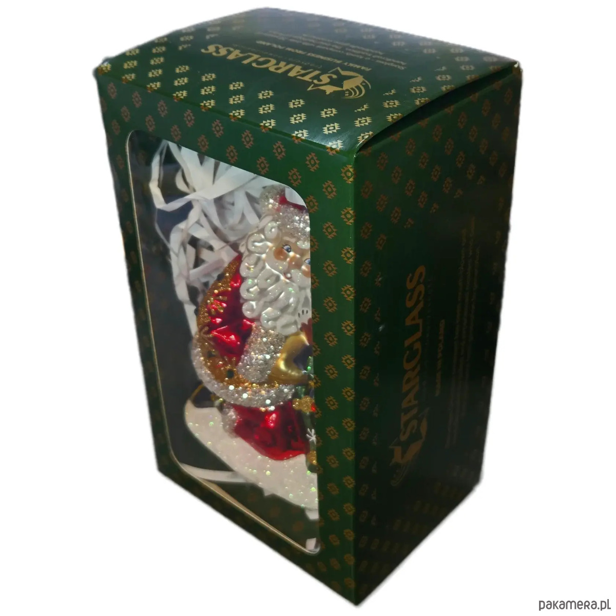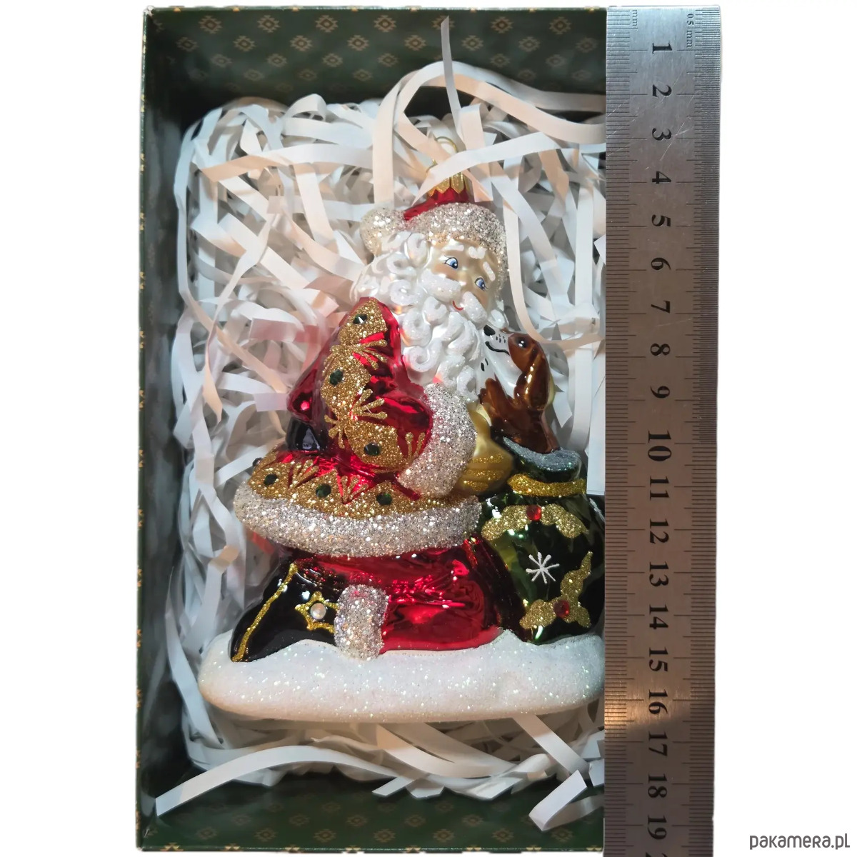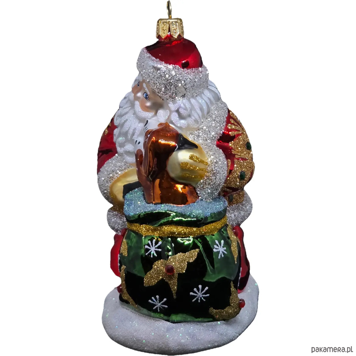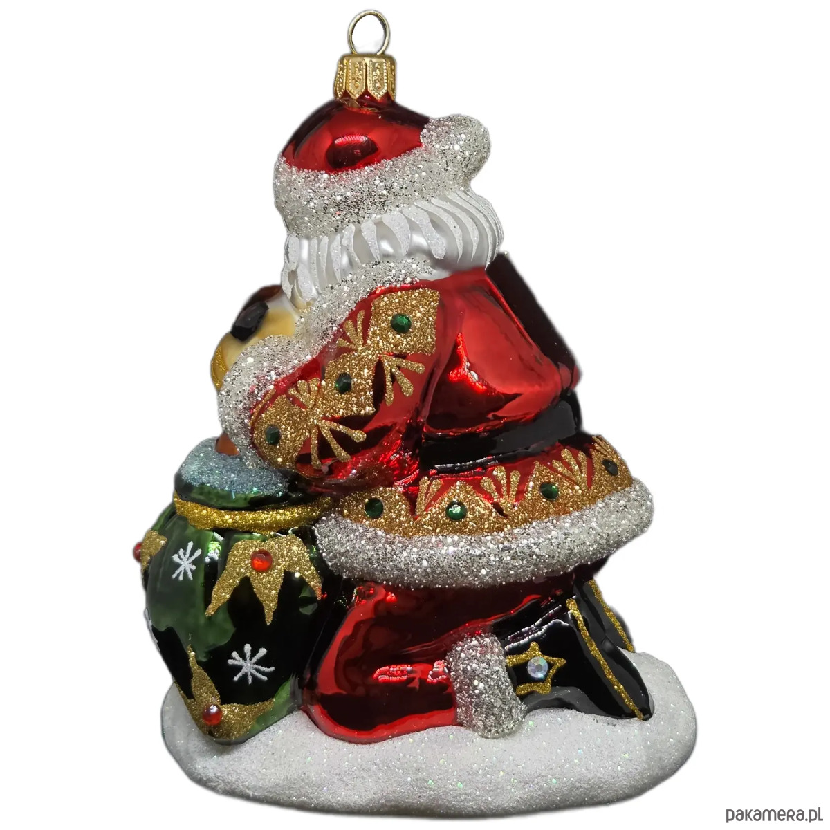 Ręcznie malowana szklana bombka Mikołaj z pieskiem w worku